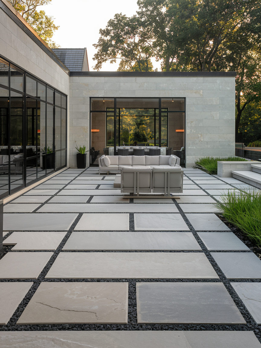Oversized stone or porcelain tiles instantly elevate a patio’s appearance. Large tiles create fewer grout lines, resulting in a cleaner and more expansive look. Choose neutral shades such as charcoal, cream, or soft gray for a timeless foundation. These tiles enhance the feeling of openness and modernity while providing durability and easy maintenance. Pair them with streamlined furniture and subtle landscaping to maintain visual balance. Large format tiles also reflect light beautifully, enhancing the patio’s brightness during the day. This flooring choice works particularly well in contemporary settings where simplicity and cohesion are key. The smooth, seamless surface provides an elegant backdrop for both casual gatherings and formal outdoor dining experiences.