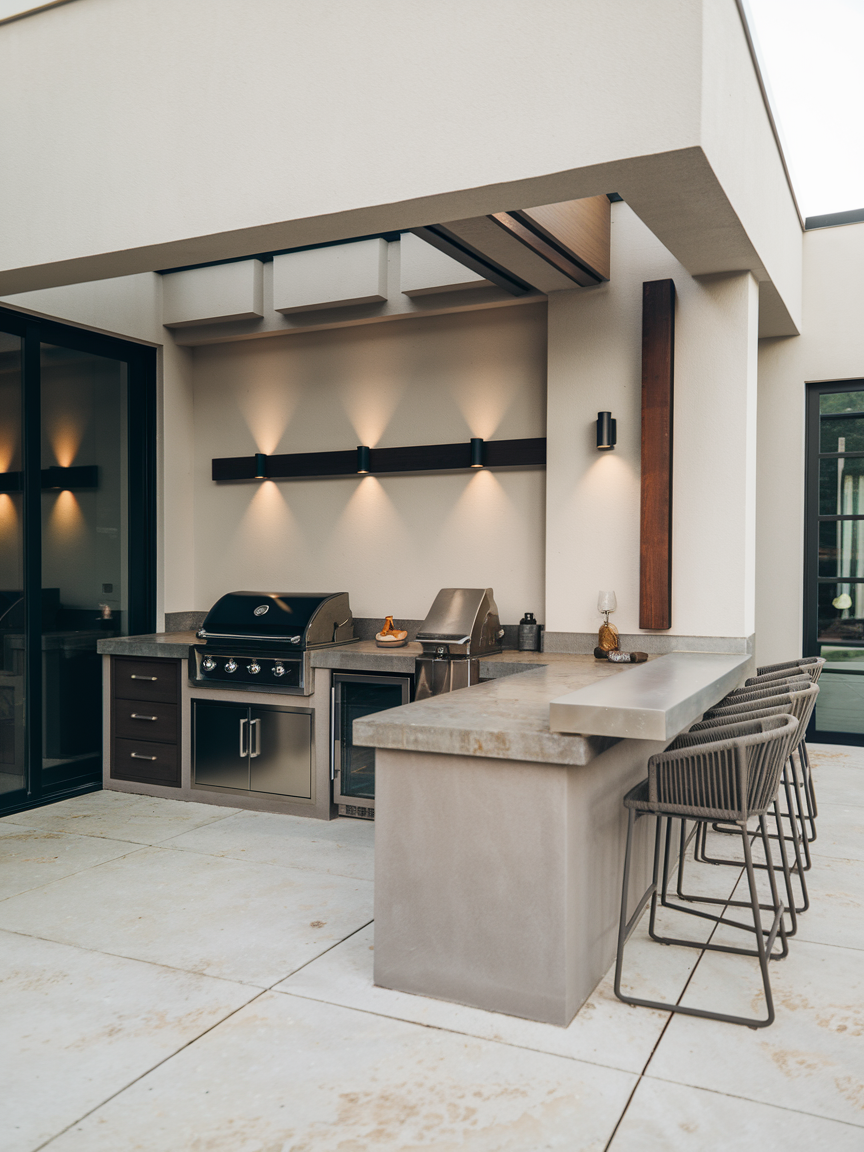 An integrated outdoor kitchen transforms your patio into a functional entertainment hub. Keep the design sleek with handleless cabinetry, stone countertops, and stainless steel appliances. Incorporate a built-in grill, mini refrigerator, and concealed storage to maintain a clutter-free look. Choose materials that complement your patio flooring for a cohesive aesthetic. Adding bar seating along the counter encourages social interaction while maintaining an elegant atmosphere. The streamlined layout ensures that the kitchen feels like a natural extension of your indoor cooking space. With thoughtful lighting and minimal decorative accents, this setup combines practicality and luxury, making outdoor entertaining effortless and stylish.