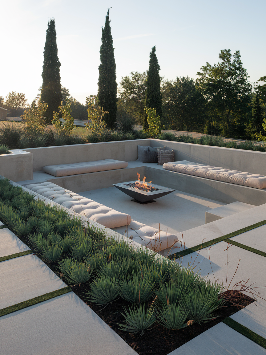 A sunken patio seating area adds architectural intrigue and cozy sophistication. By lowering the seating zone slightly below the surrounding surface, you create an intimate gathering space. Use built-in benches with plush cushions and surround the center with a modern fire feature. The lowered design naturally shields the space from wind and enhances privacy. Neutral tones and subtle lighting amplify the refined look. This idea works beautifully in larger backyards where you want a designated conversation area. The visual layering adds depth and dimension while maintaining clean lines. It’s a striking way to redefine outdoor living with both comfort and style.