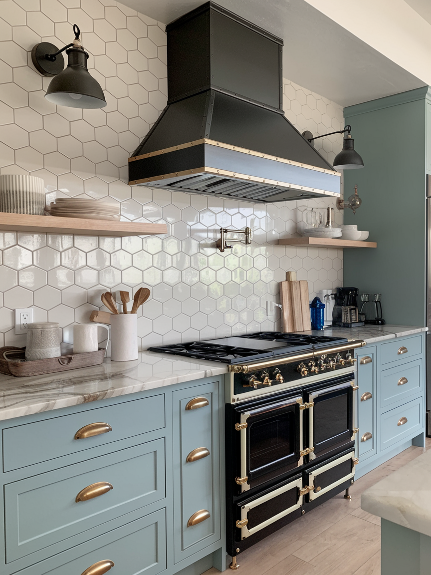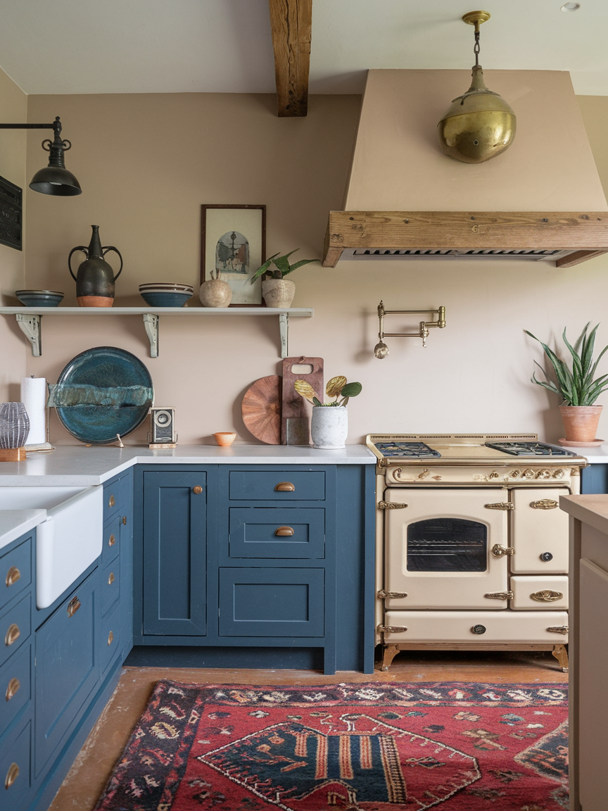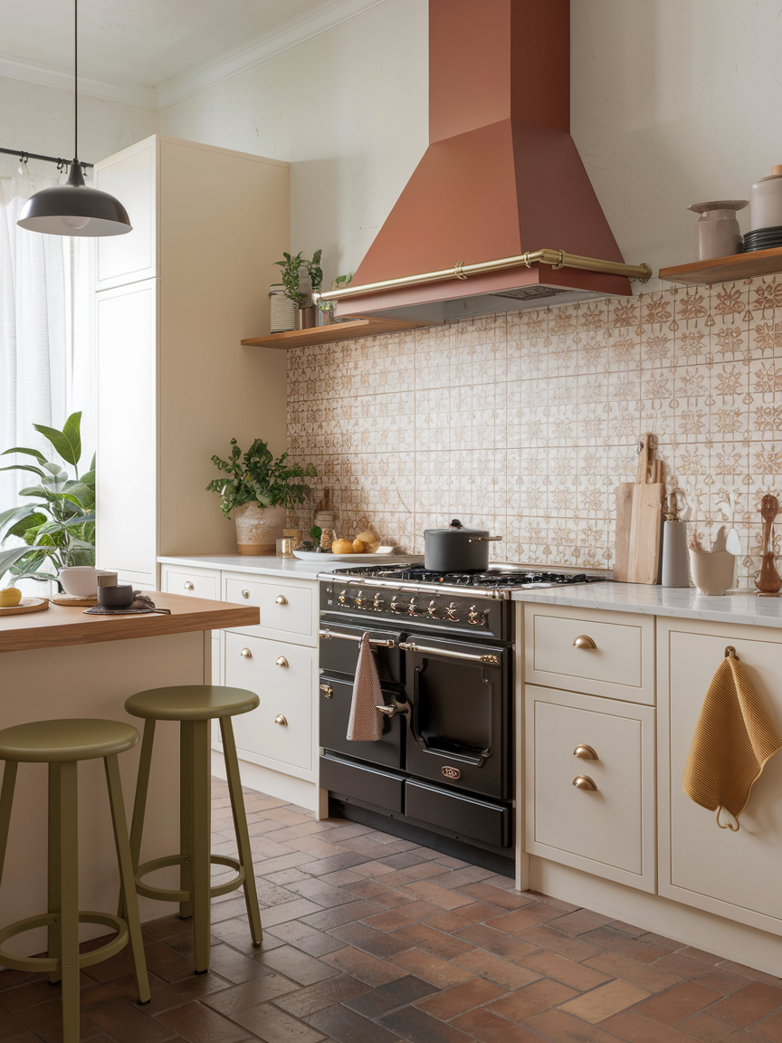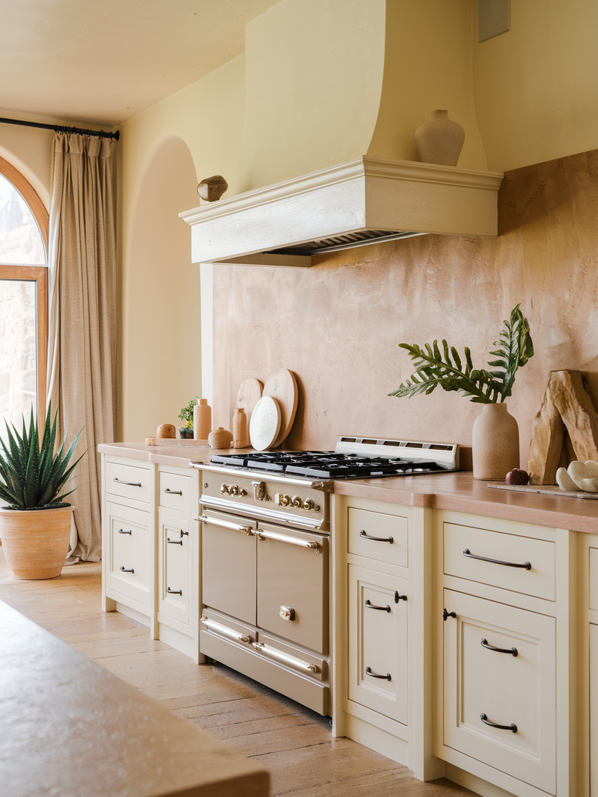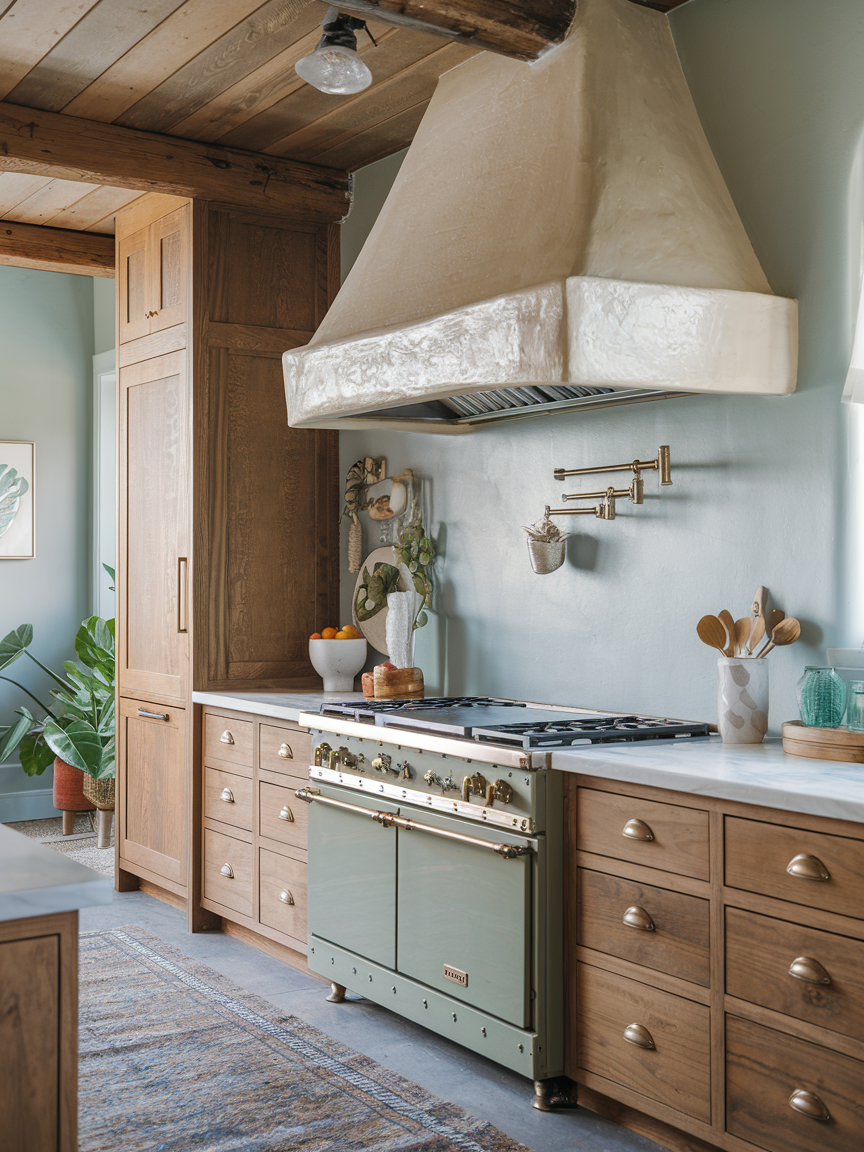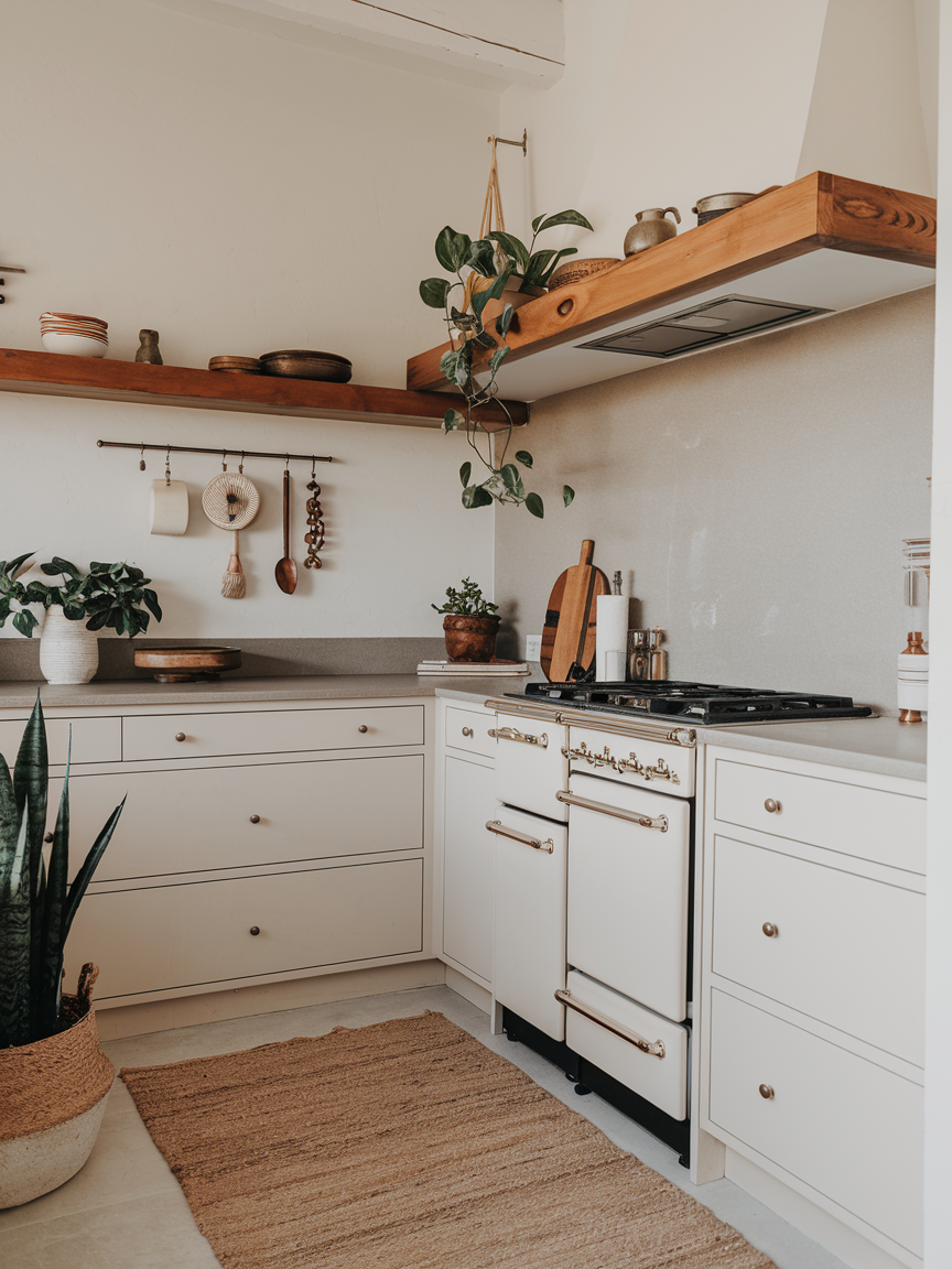 A statement range hood can become a stunning focal point in a modern boho kitchen. Materials such as plaster, wood, or textured finishes create visual interest while blending with the organic aesthetic. A custom hood in a soft neutral tone keeps the design cohesive while adding architectural presence. Wood details or curved shapes enhance warmth and soften the surrounding cabinetry. Because the range hood naturally draws attention, keeping other elements simple helps maintain balance. This feature elevates the kitchen’s design and adds a sense of craftsmanship, making the space feel both functional and thoughtfully styled.