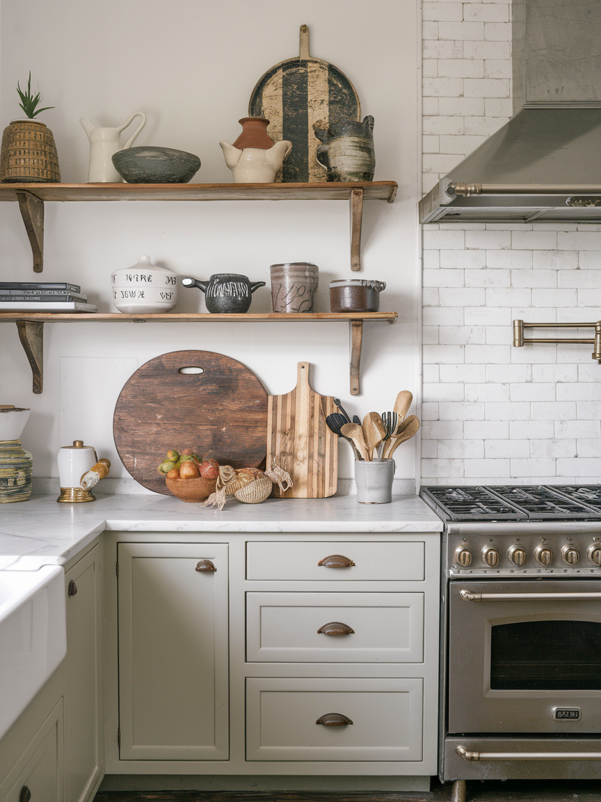 Incorporating vintage or handmade pieces adds personality and authenticity to the kitchen. Antique cutting boards, handcrafted pottery, or thrifted decor items create a collected-over-time feel. These elements bring warmth and uniqueness that mass-produced pieces often lack. Mixing old and new items keeps the space interesting while maintaining a modern foundation. Displaying these accents on open shelves or countertops adds charm without cluttering the space. Vintage touches help tell a story and make the kitchen feel personal, creative, and full of character.