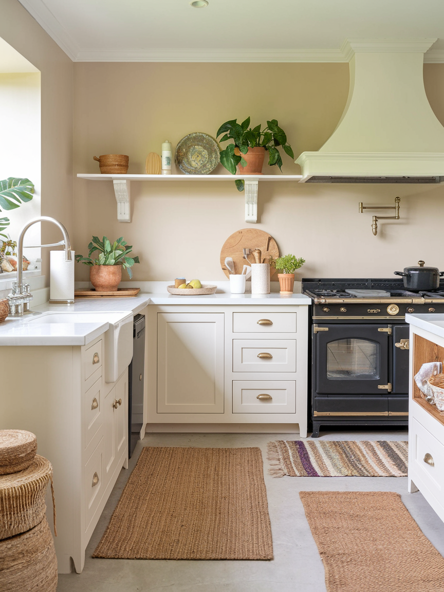 Natural fiber rugs add warmth, texture, and comfort to a modern boho kitchen while enhancing its organic character. Materials such as jute, sisal, cotton, or wool introduce an earthy element that softens hard flooring surfaces like tile or wood. Neutral tones and subtle patterns help the rug blend seamlessly into the overall design while still adding visual interest. Placing a rug in front of the sink, along a walkway, or beneath a dining area helps define functional zones within the space. In addition to improving comfort underfoot, natural rugs contribute to a cozy, lived-in atmosphere. Choosing durable, easy-to-clean materials ensures practicality in a busy kitchen while maintaining the relaxed, layered look that defines modern boho style.