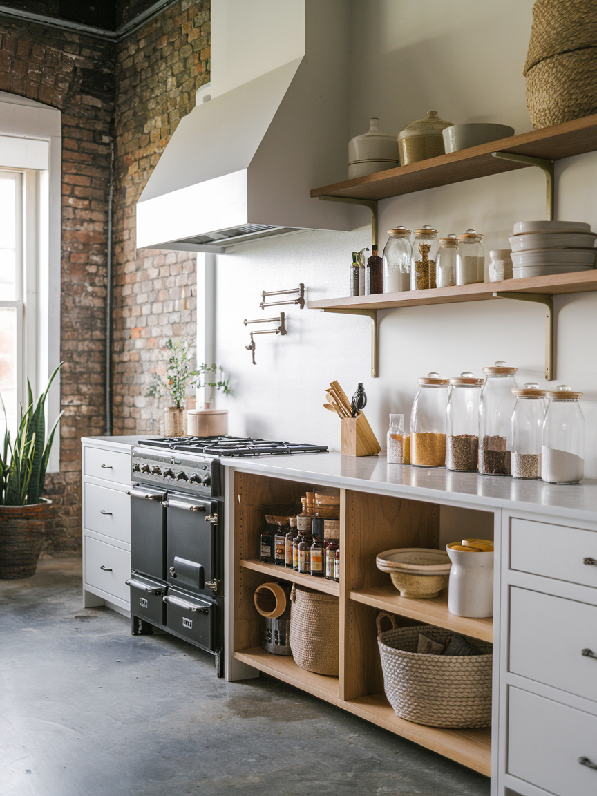 An open pantry combines practicality with aesthetic appeal, making it a perfect feature for a modern boho kitchen. Instead of hiding everything behind doors, neatly arranged glass jars, ceramic containers, and woven baskets create a visually pleasing display. Grouping items by color, size, or function helps maintain an organized look while still embracing the relaxed boho vibe. Natural materials such as wood shelving and rattan storage enhance the organic feel of the space. An open pantry also makes everyday ingredients easier to access, improving functionality during cooking. This approach encourages mindful organization and turns storage into a decorative element, helping the kitchen feel both efficient and beautifully styled.