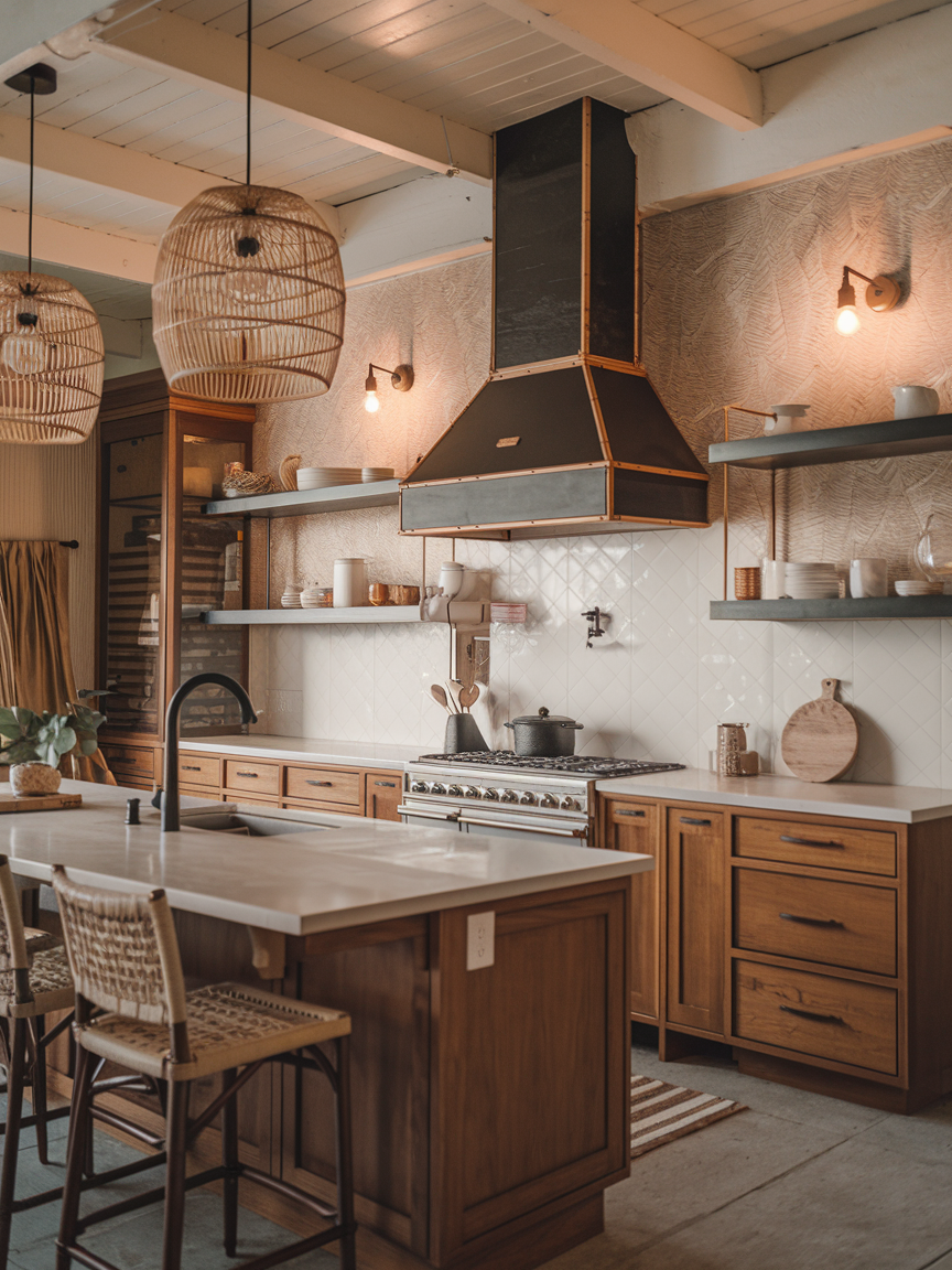 Woven pendant lights bring warmth and natural texture into the kitchen while creating soft, inviting illumination. Materials like rattan, bamboo, or wicker complement wood elements and enhance the organic boho feel. Hanging woven pendants above a kitchen island or dining area adds a relaxed yet stylish focal point. The natural materials soften modern surfaces like stone or metal, helping the space feel more comfortable and approachable. Choosing simple shapes keeps the look modern while allowing the texture to stand out. These lights add both function and personality, making the kitchen feel cozy and thoughtfully designed.