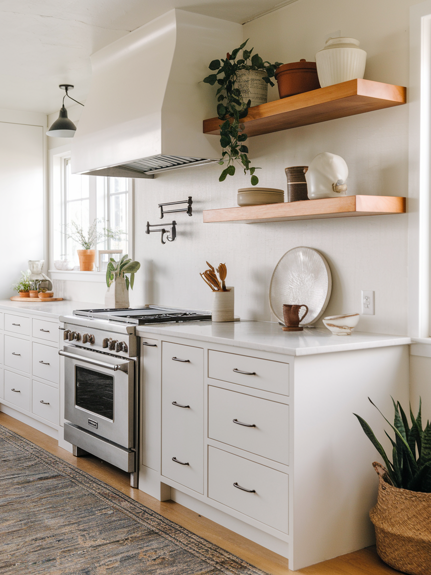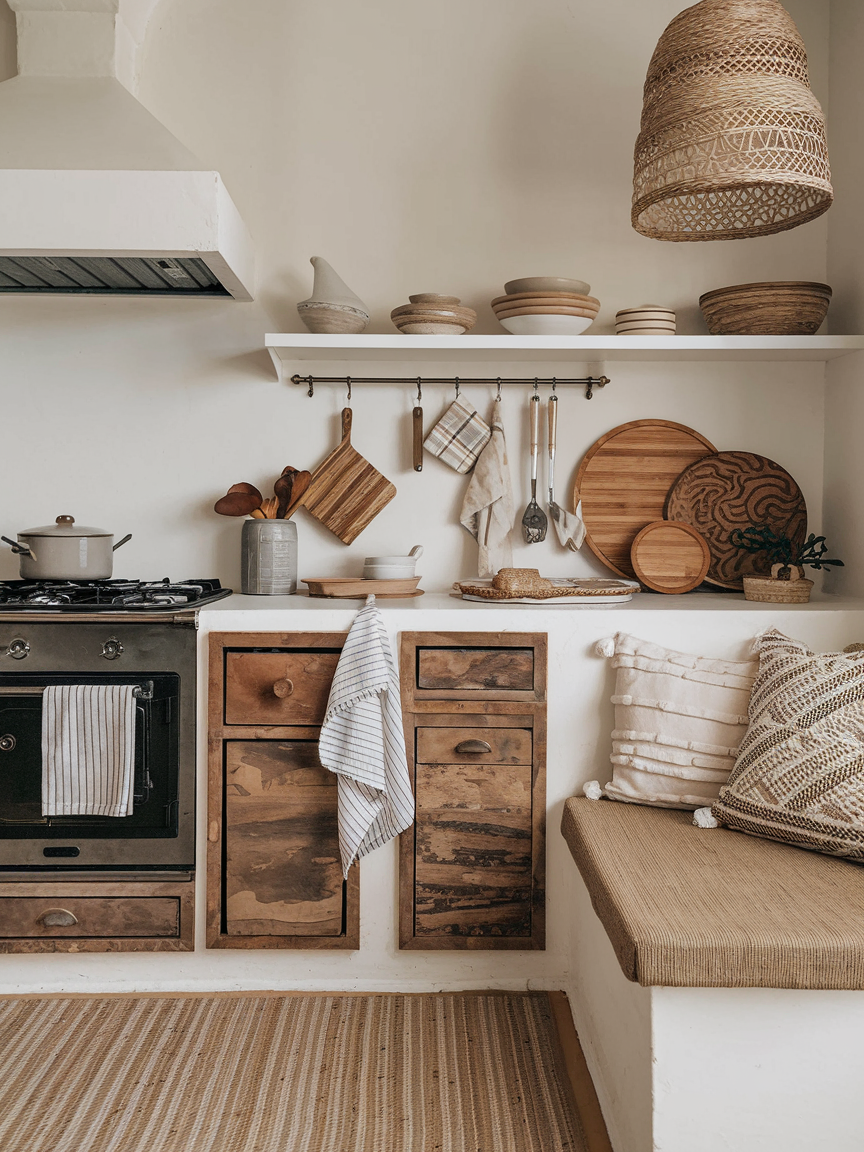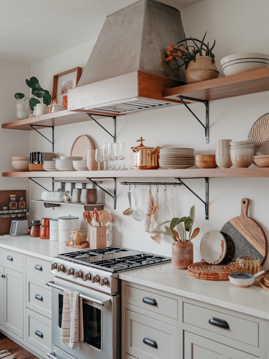 Floating wooden shelves provide both storage and warmth while keeping the kitchen feeling open and airy. Unlike bulky upper cabinets, these shelves allow walls to remain visually light while showcasing everyday essentials and decorative pieces. Natural wood finishes add organic texture and complement other boho elements such as ceramics, plants, and woven accents. Styling the shelves with a mix of functional items and decorative objects creates a balanced, curated look. Keeping the arrangement simple and cohesive prevents visual clutter. Floating shelves also make frequently used items easily accessible, combining convenience with style. This feature enhances both practicality and the relaxed charm of a modern boho kitchen.