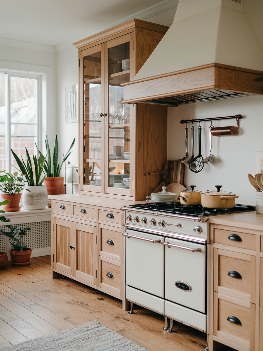 Natural wood cabinetry is a defining feature of modern boho kitchens because it adds warmth, texture, and organic beauty. Light oak, walnut, or reclaimed wood finishes create a grounded and inviting atmosphere. Flat-panel cabinet styles keep the look contemporary, while the natural grain adds character and depth. Pairing wood cabinetry with light countertops and neutral walls prevents the space from feeling heavy. This balance between modern simplicity and natural texture helps achieve the perfect boho-modern blend. Wood cabinetry also ages beautifully over time, making it a practical and stylish investment for a kitchen designed for long-term comfort.