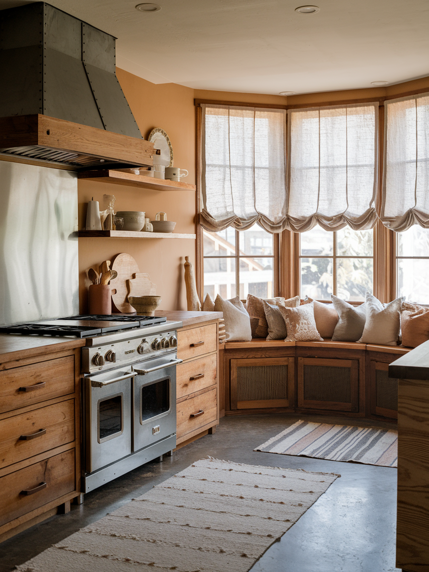 Soft window treatments help filter natural light while adding texture and warmth to the kitchen. Linen or cotton curtains in neutral or earthy tones create a relaxed, airy feel that complements modern boho style. Sheer fabrics allow sunlight to brighten the space while maintaining privacy. Floor-length panels or simple café curtains soften the lines of windows and enhance the cozy atmosphere. Choosing natural materials ensures the treatments blend seamlessly with wood, stone, and other organic elements. These soft layers improve comfort, control glare, and make the kitchen feel more inviting and complete.