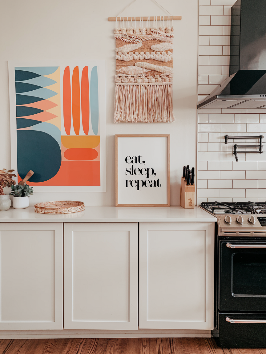 Layered wall art adds personality and visual depth without overwhelming the space. A mix of framed prints, woven wall hangings, or simple artwork in neutral tones enhances the boho character while keeping the design cohesive. Choosing pieces that reflect natural themes, abstract patterns, or handmade textures helps maintain the organic aesthetic. Arranging artwork in small groupings creates a curated look that feels intentional and balanced. Wall art is also easy to update over time, allowing the kitchen to evolve with your style. These decorative layers bring warmth and individuality while keeping the overall design clean and modern.