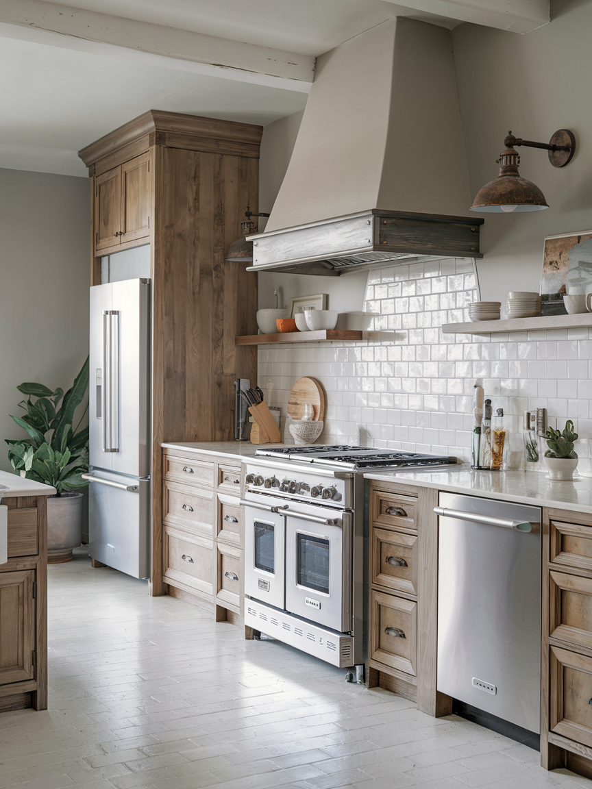 Integrating appliances into the cabinetry helps maintain a seamless and cohesive look in a modern boho kitchen. Panel-ready refrigerators and dishwashers blend with cabinet finishes, reducing visual clutter and supporting a clean design. Choosing appliances in neutral colors such as white, black, or stainless steel also helps maintain harmony with the overall palette. This approach keeps the focus on natural materials, textures, and decorative elements rather than bulky equipment. A streamlined appliance layout improves the kitchen’s visual flow and enhances its modern appeal while still supporting everyday functionality.