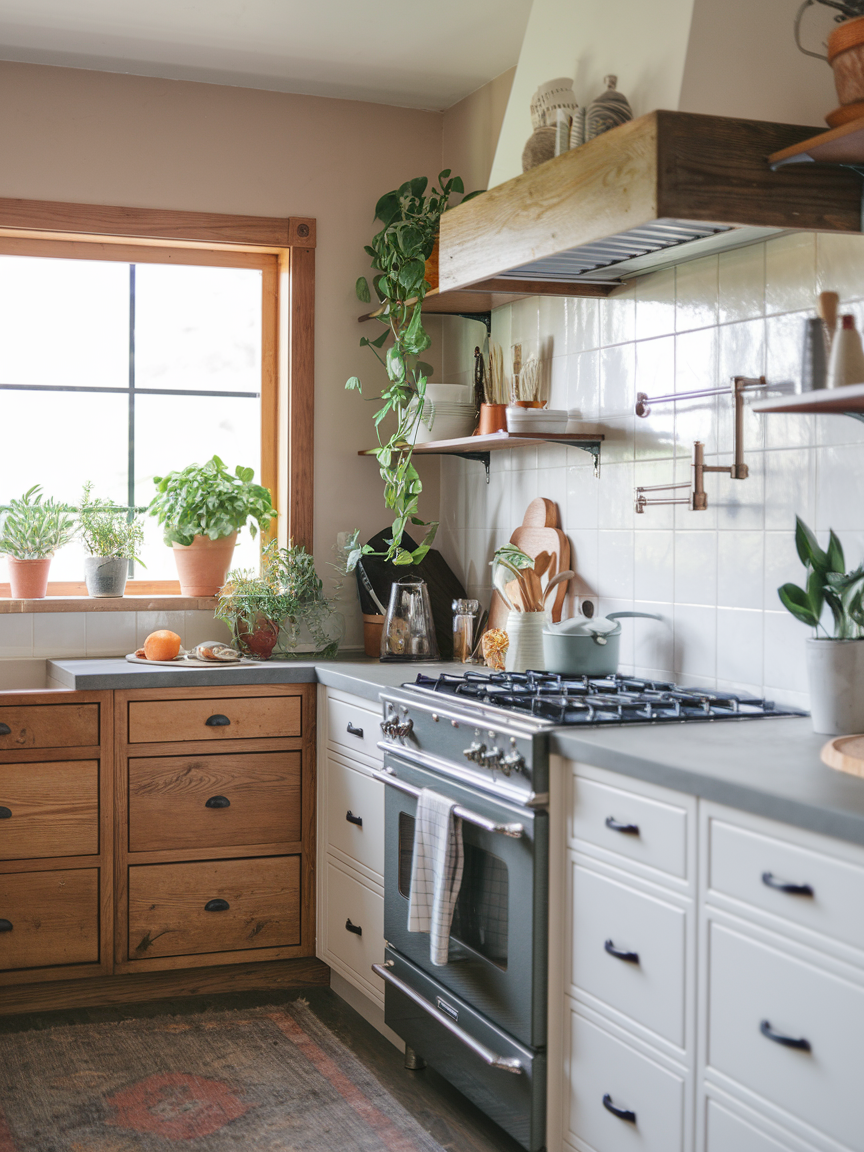 Plants are essential in modern boho kitchens because they bring life, color, and freshness into the space. Small potted herbs on windowsills, trailing plants on shelves, or larger floor plants create a natural, calming atmosphere. Greenery pairs beautifully with wood and neutral tones, enhancing the organic feel. In addition to visual appeal, fresh herbs add functionality for everyday cooking. Choosing a mix of plant sizes and textures helps create depth and interest. This simple addition makes the kitchen feel vibrant, healthy, and connected to nature.