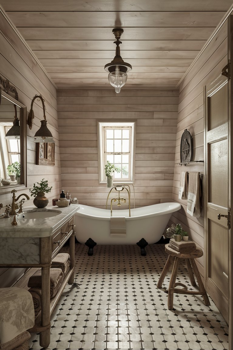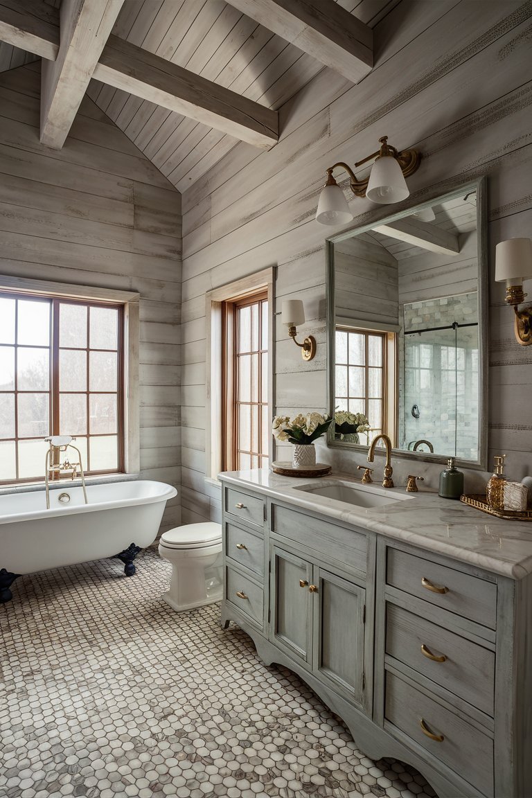 The floor, with its intricate honeycomb tile pattern, adds depth and a hint of vintage style to the bathroom. These small, hexagonal tiles bring subtle texture to the room and enhance its visual appeal without overpowering the other design elements. Their soft, natural tones complement the color palette, tying the room together. The tiles’ stone or marble appearance introduces a refined touch, adding elegance to the rustic space while being durable and easy to maintain. This choice of flooring creates a gentle contrast with the shiplap walls, giving the room a well-rounded, balanced feel.