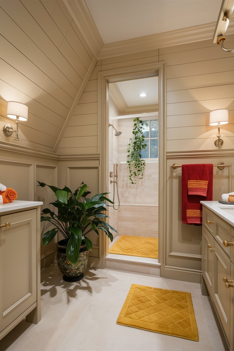 The shiplap walls are painted in a soft, warm neutral tone that creates a serene and inviting atmosphere. This color choice is perfect for a farmhouse-style bathroom, as it brings warmth without overwhelming the space, allowing other elements to stand out. The vertical shiplap design accentuates the height of the sloped ceiling, making the bathroom feel more spacious and airy. This paneling adds texture and dimension to the walls, a hallmark of farmhouse decor, while maintaining a clean, uncluttered look that complements the minimalist aesthetic of the room.