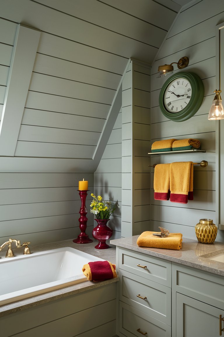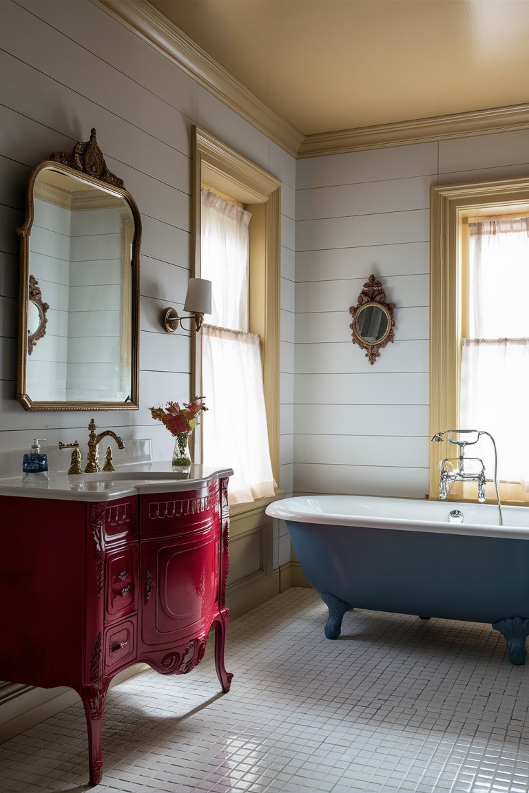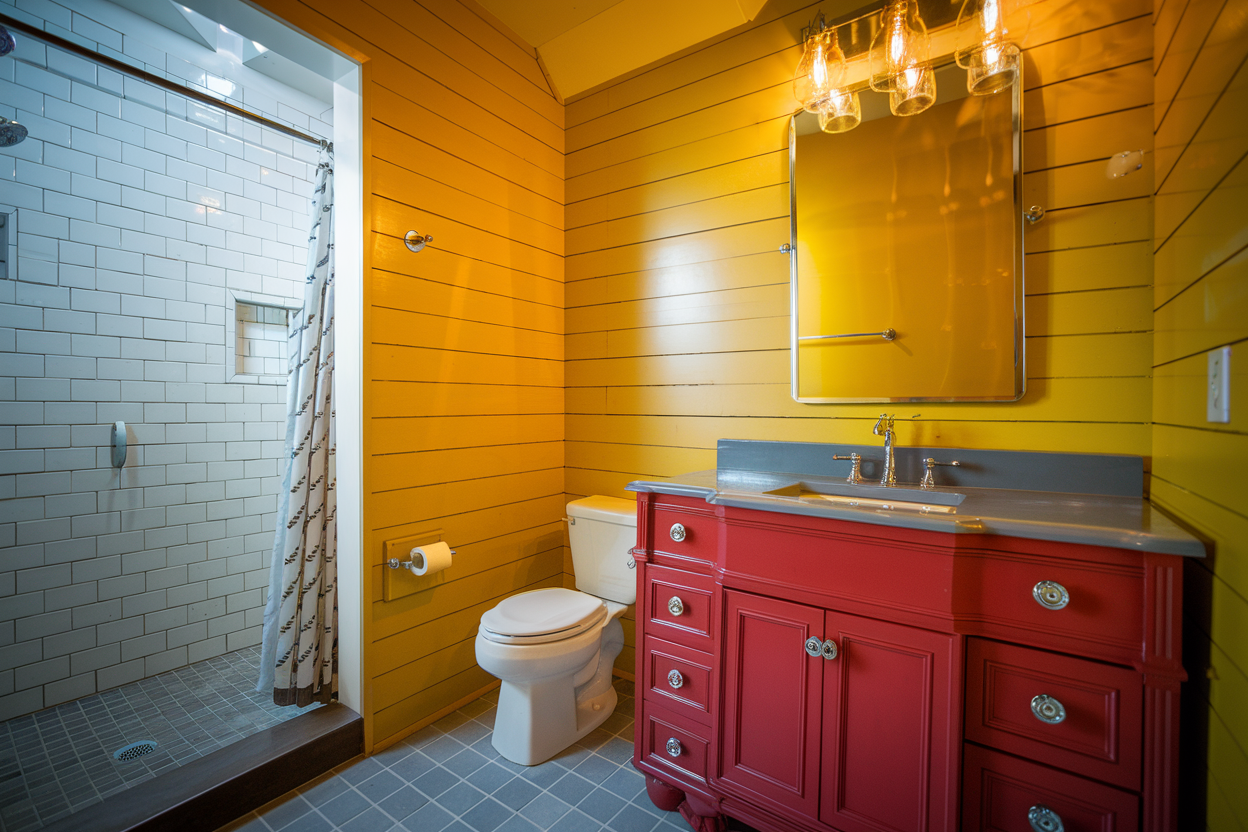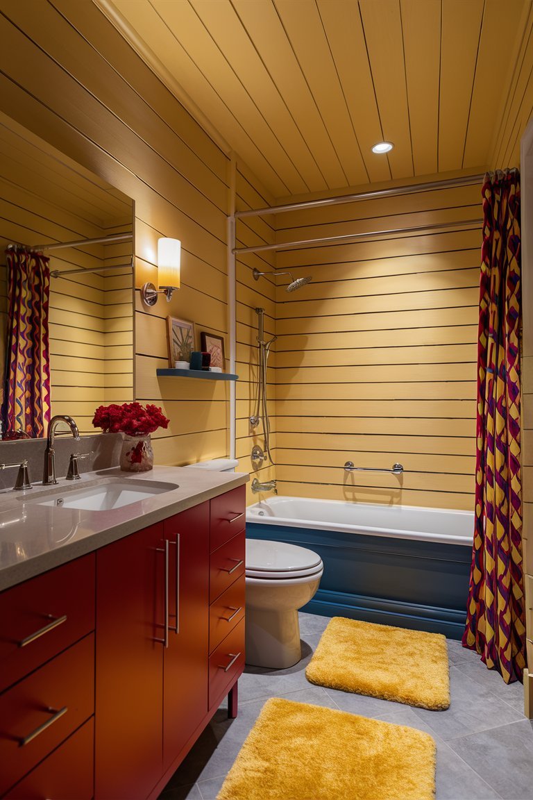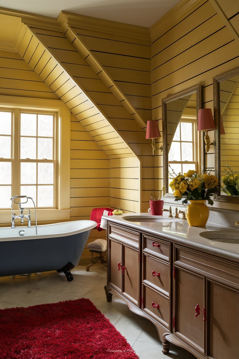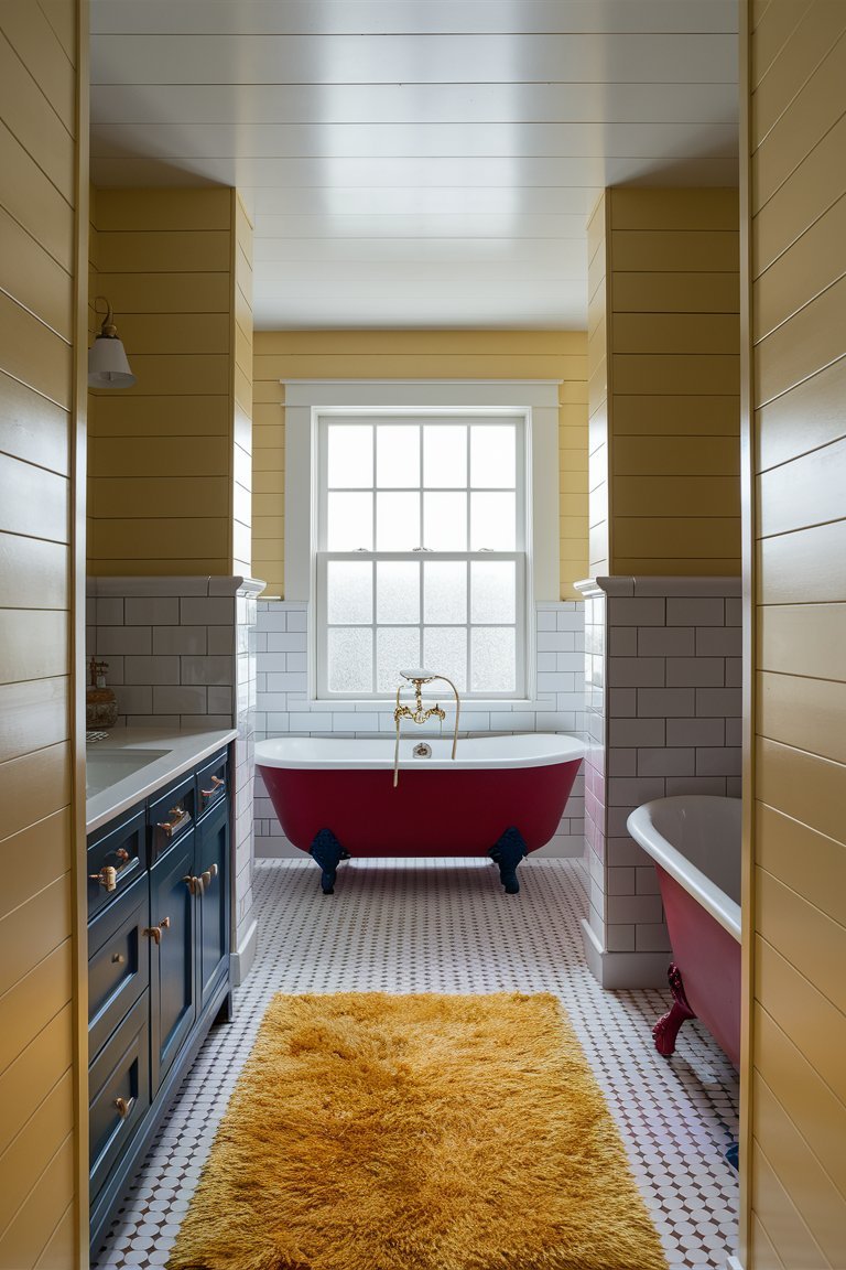 The most eye-catching feature in this bathroom is undoubtedly its bold color palette. The mustard yellow shiplap walls add a warm, sunny glow to the room, creating a cheerful atmosphere that’s hard to ignore. The red clawfoot tub serves as a statement piece, bringing a playful energy that contrasts beautifully with the more neutral tones in the room. This choice of color deviates from the typical muted farmhouse shades, proving that farmhouse style can be both lively and sophisticated. The vibrant color scheme not only modernizes the space but also infuses it with personality and charm.