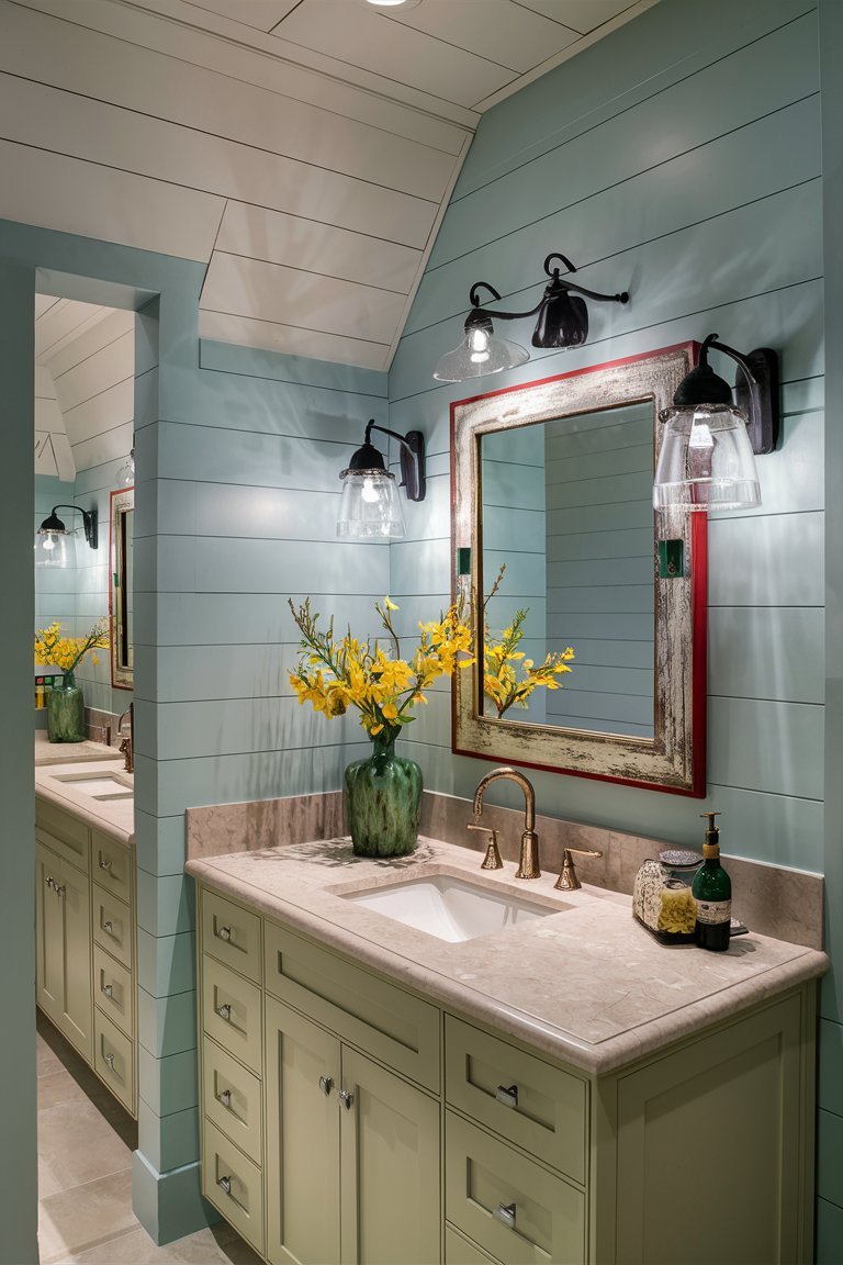 The bold red vanity cabinet adds a striking contrast to the yellow shiplap walls, creating a vivid, contemporary farmhouse aesthetic. With its sleek lines and chrome handles, the vanity brings a modern edge to the rustic shiplap background, blending two styles harmoniously. The red tone not only anchors the room visually but also adds a sense of depth and sophistication. This choice of color for the cabinetry is unconventional for farmhouse design, showing that vibrant hues can be incorporated without compromising the space’s charm.