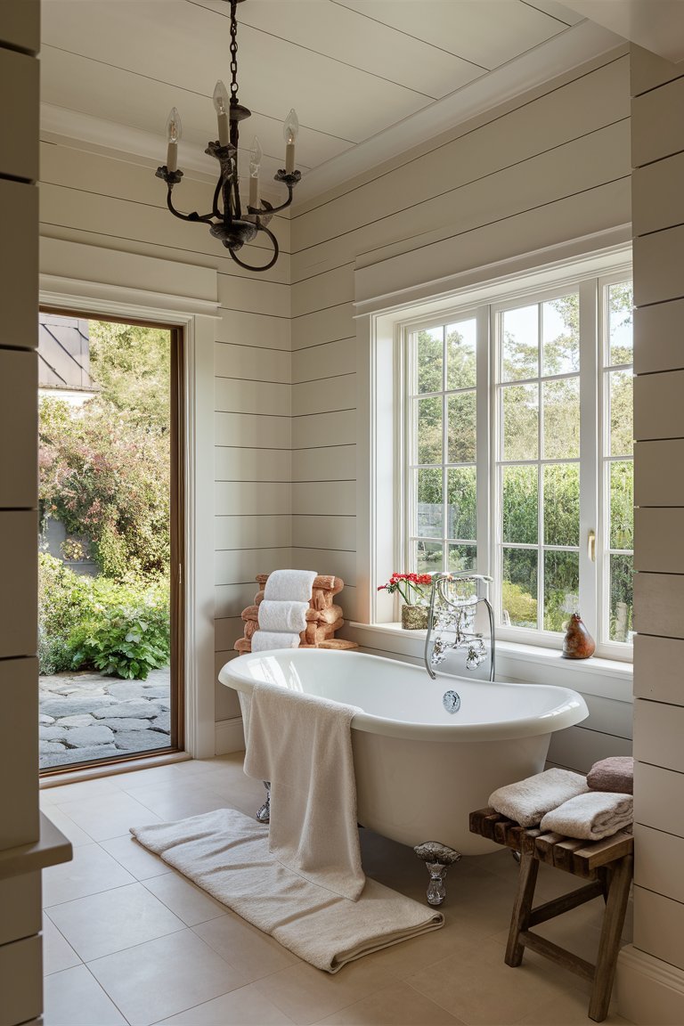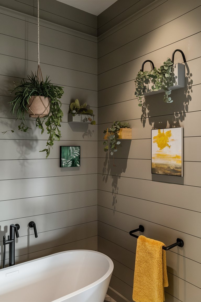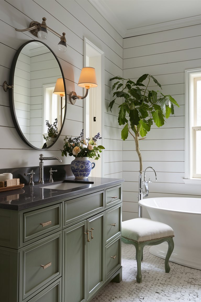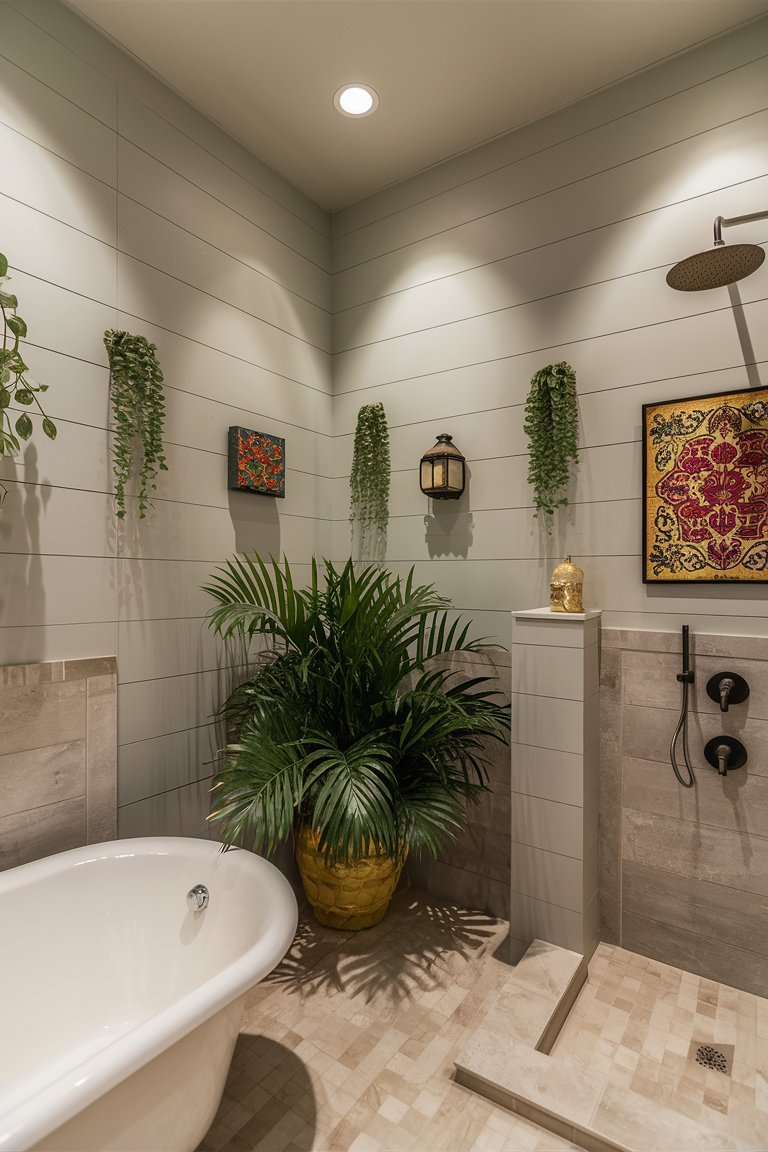 The lighting in this bathroom is carefully balanced, combining recessed ceiling lights and the wall-mounted lantern to ensure a well-lit space. The warm glow from these lights enhances the room’s inviting atmosphere, creating a space that feels both cozy and sophisticated. The lighting setup highlights the texture of the shiplap walls and the depth of the greenery, making the room appear vibrant and welcoming. This careful attention to lighting is essential in achieving a bathroom that feels comfortable and relaxing.