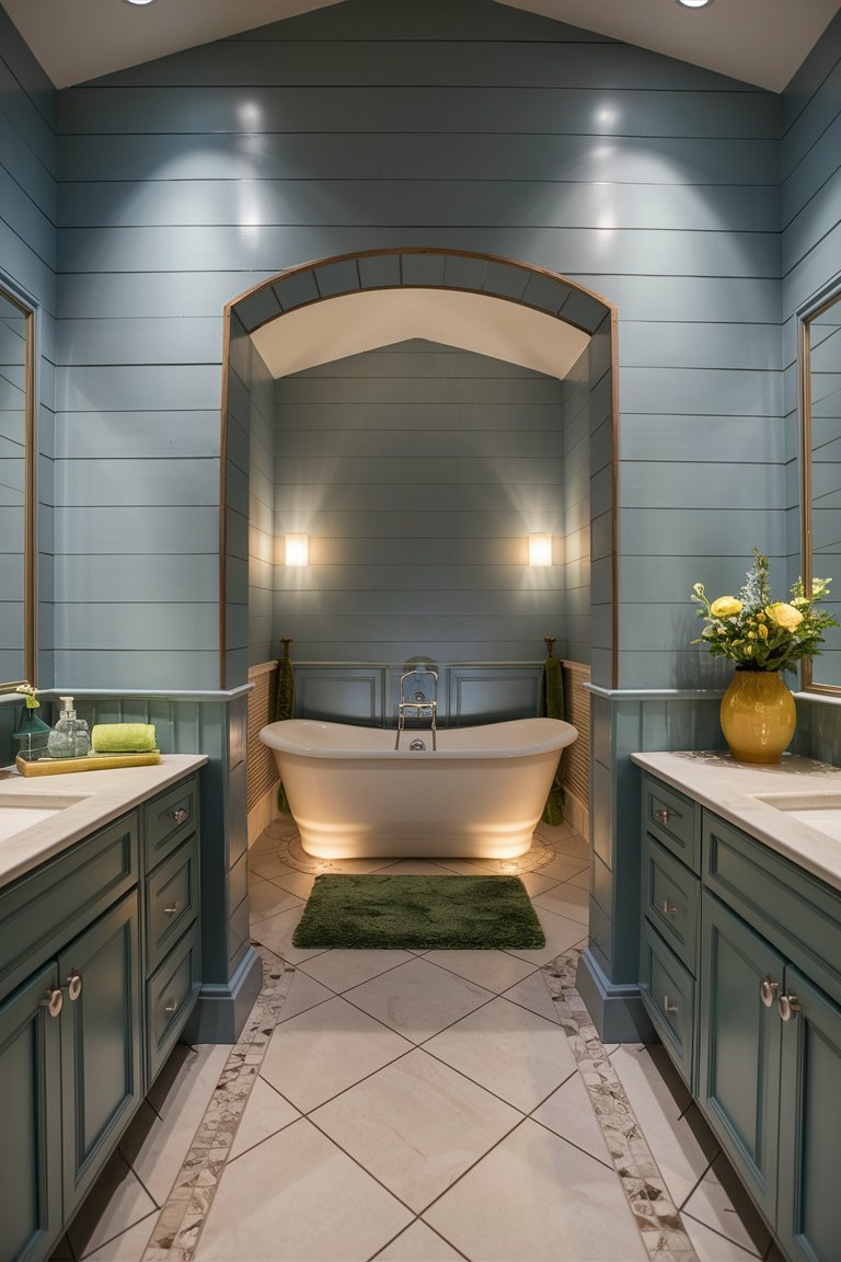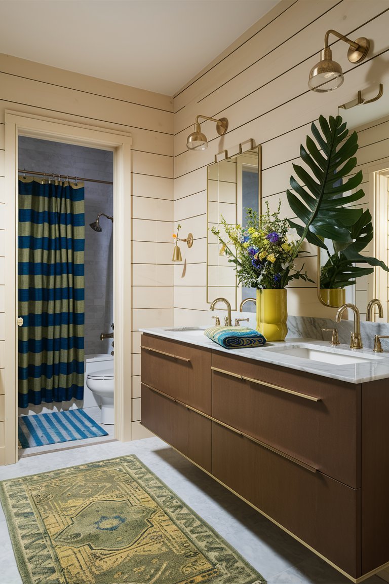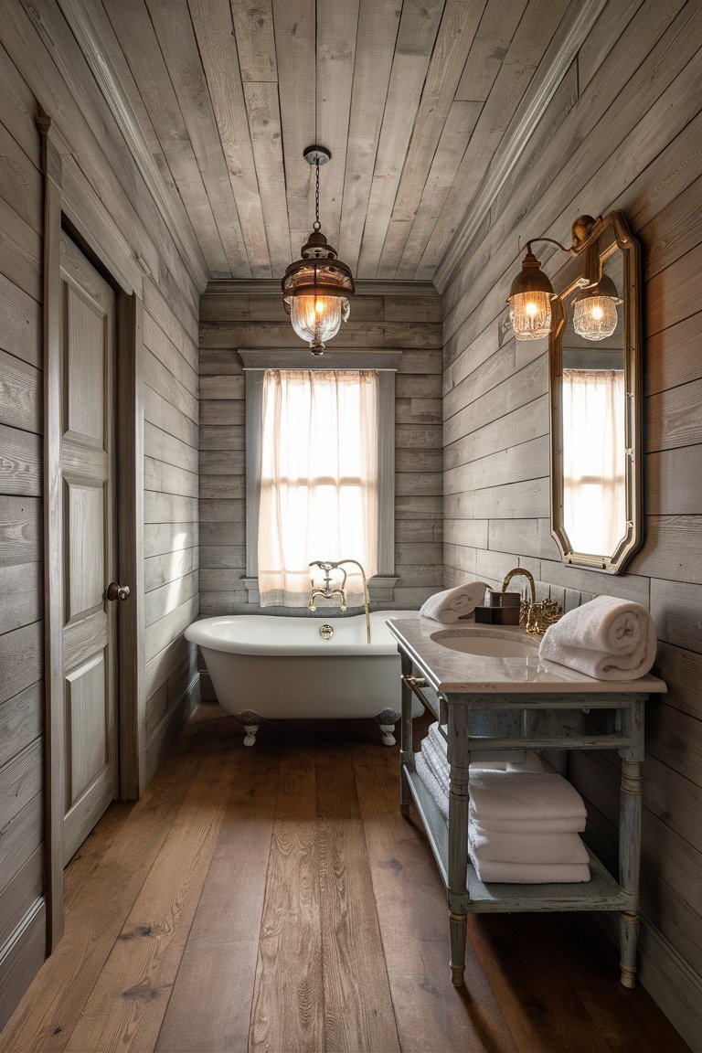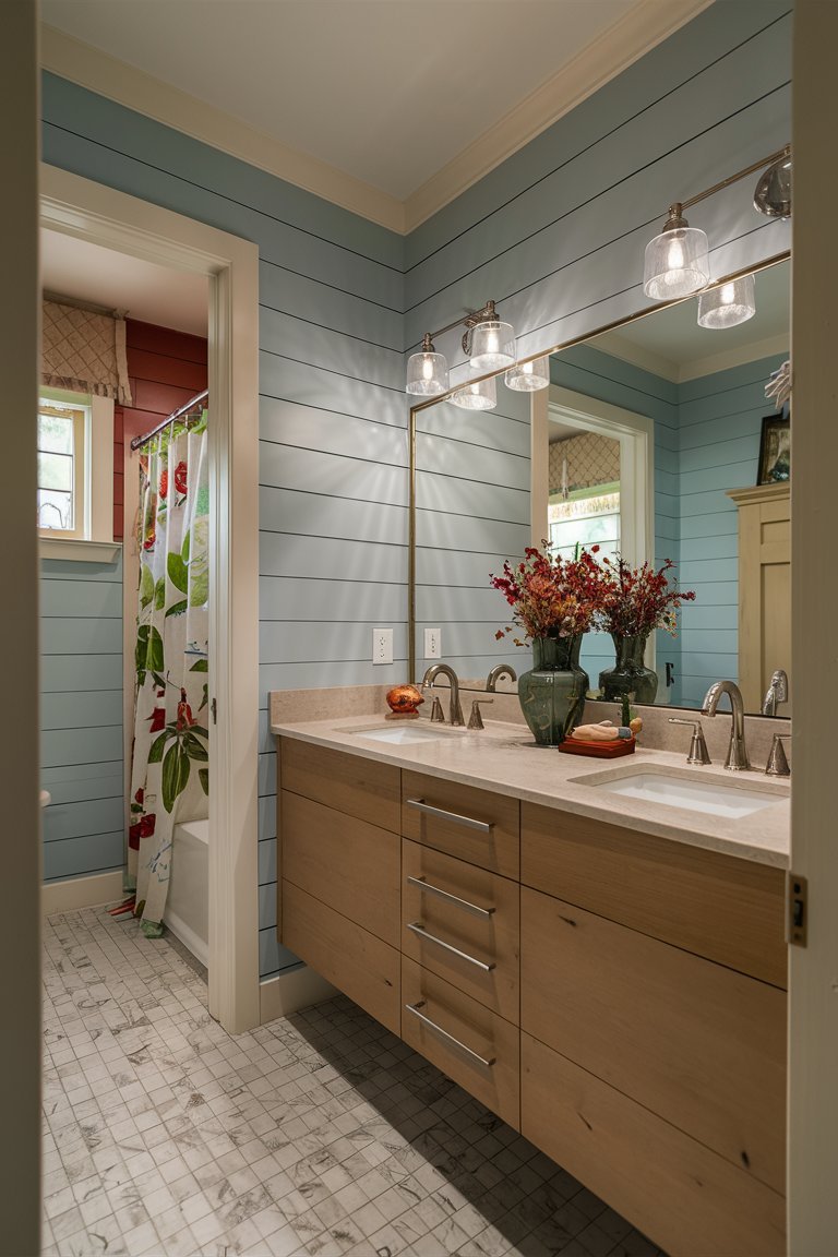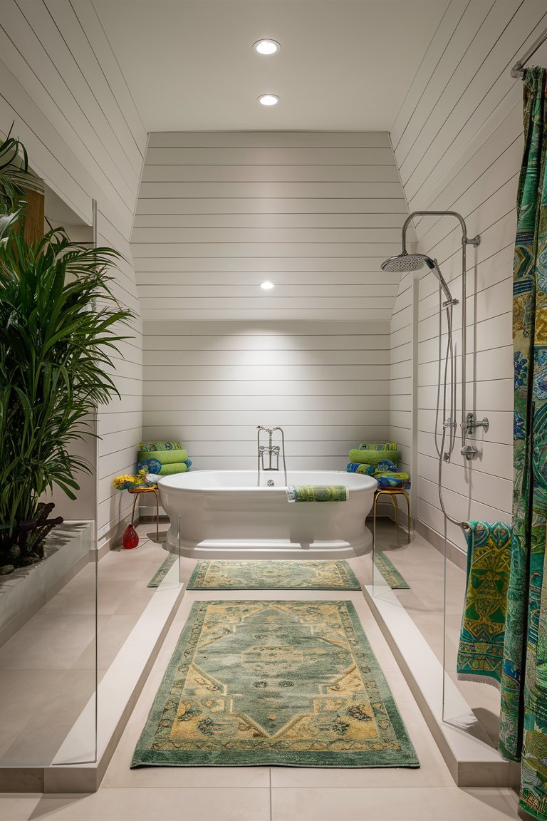 The lighting in this bathroom is carefully balanced, combining recessed ceiling lights and the wall-mounted lantern to ensure a well-lit space. The warm glow from these lights enhances the room’s inviting atmosphere, creating a space that feels both cozy and sophisticated. The lighting setup highlights the texture of the shiplap walls and the depth of the greenery, making the room appear vibrant and welcoming. This careful attention to lighting is essential in achieving a bathroom that feels comfortable and relaxing.