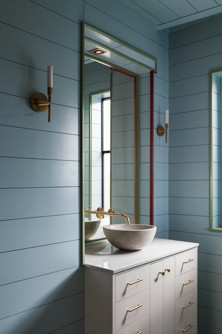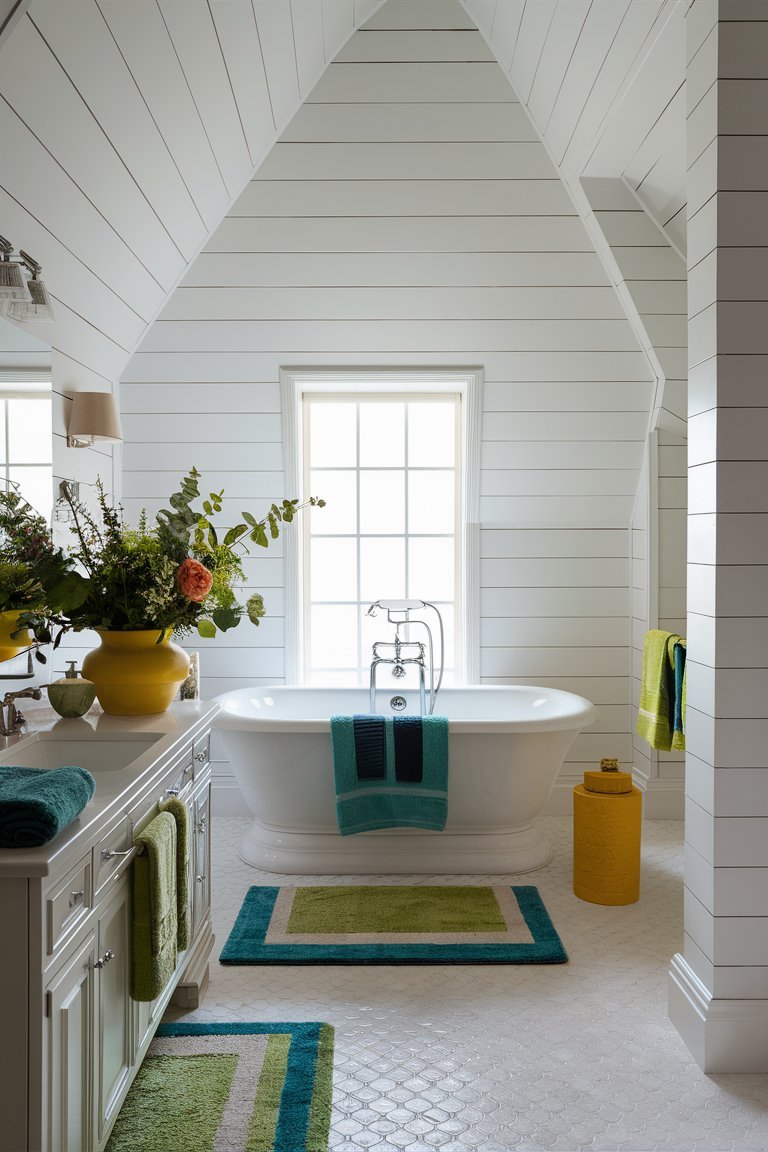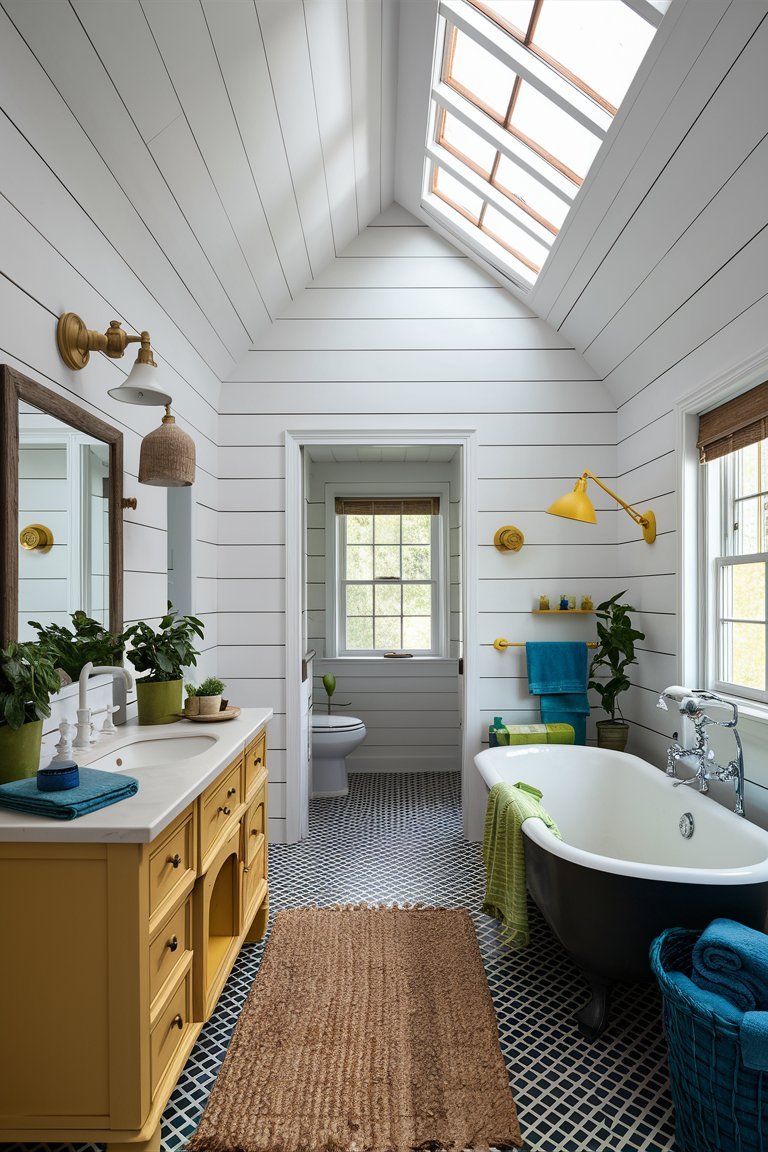 The vaulted ceiling, outfitted with large skylights, is a striking feature that instantly opens up the room and floods it with natural light. This architectural choice not only enhances the sense of spaciousness but also serves as a practical way to reduce the need for artificial lighting during the day. The skylights allow sunlight to stream in, creating an uplifting and airy environment that brightens the entire bathroom. By highlighting the clean lines of the shiplap walls, these skylights bring out the best in the modern farmhouse aesthetic. This abundance of natural light also allows the bold colors in the room to appear vibrant without overwhelming the senses, making the space feel warm and welcoming.