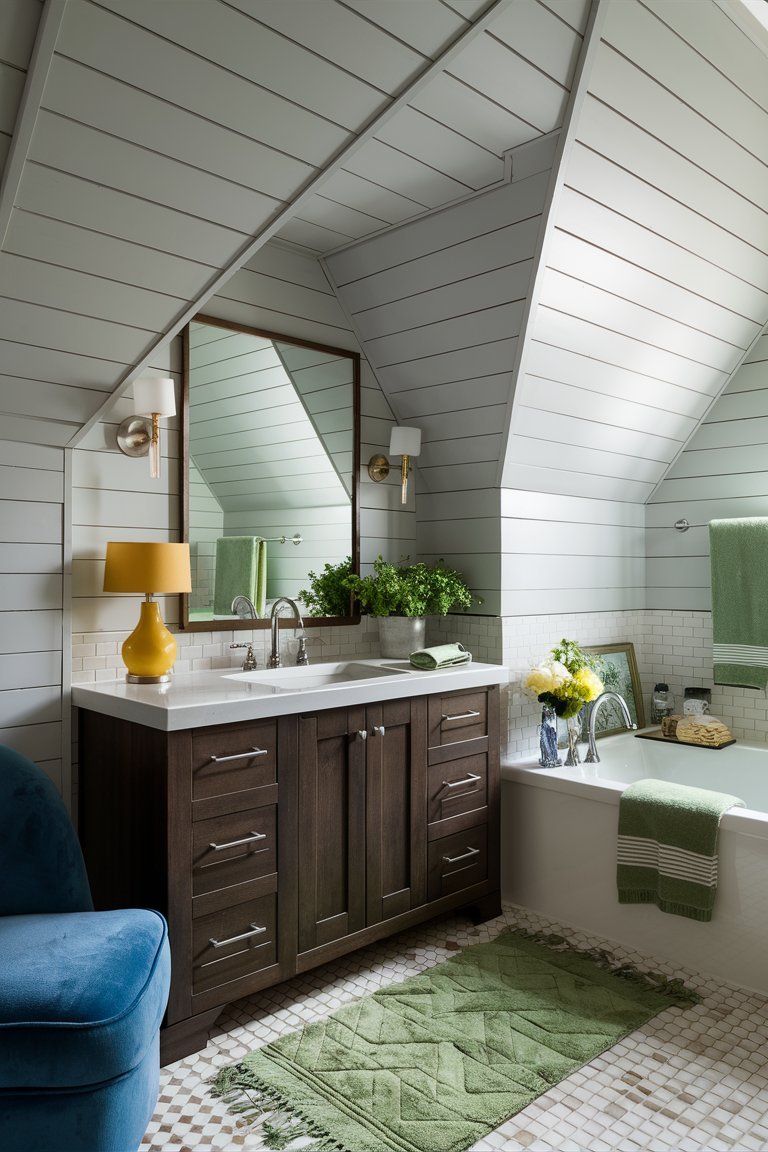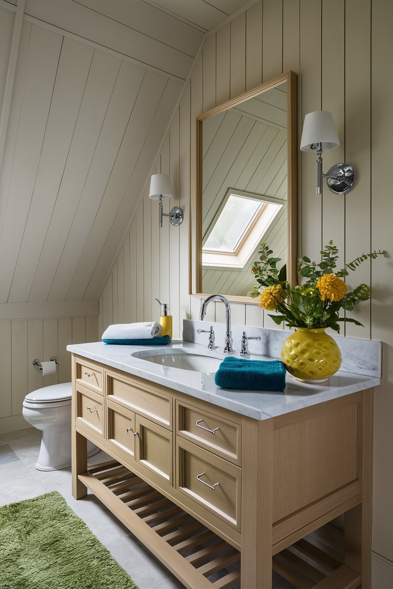 The sloped ceiling, reminiscent of attic architecture, gives the bathroom a cozy, intimate feel. This unique architectural feature is emphasized by the shiplap’s vertical alignment, creating a sense of height and openness despite the room’s compact size. The angled ceiling adds character, making the bathroom feel like a secluded retreat. This design choice is particularly effective in smaller spaces, where the right architectural details can make a room feel expansive and inviting.