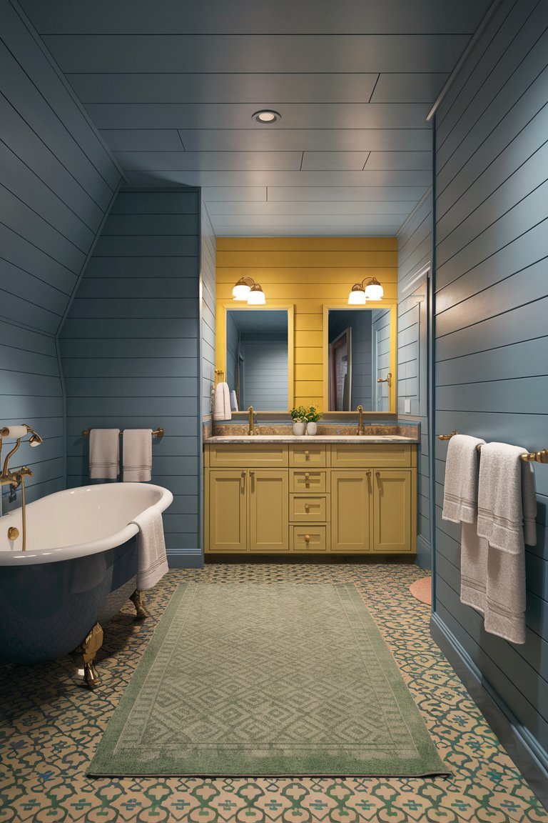 The most immediately arresting element of this bathroom is the bold color contrast. The rich, deep blue walls that envelop the majority of the space evoke a calming, serene vibe, perfect for a bathroom retreat. Meanwhile, the unexpected mustard yellow around the vanity adds an invigorating warmth, breaking up the monotony and injecting personality. This choice to juxtapose a cool tone with a warm, lively shade gives the space an innovative edge. Unlike the neutral palettes traditionally seen in farmhouse designs, this bathroom plays with color in a way that’s refreshing and original. It’s a confident design decision that gives the room character and contemporary flair without sacrificing the cozy, rustic appeal.