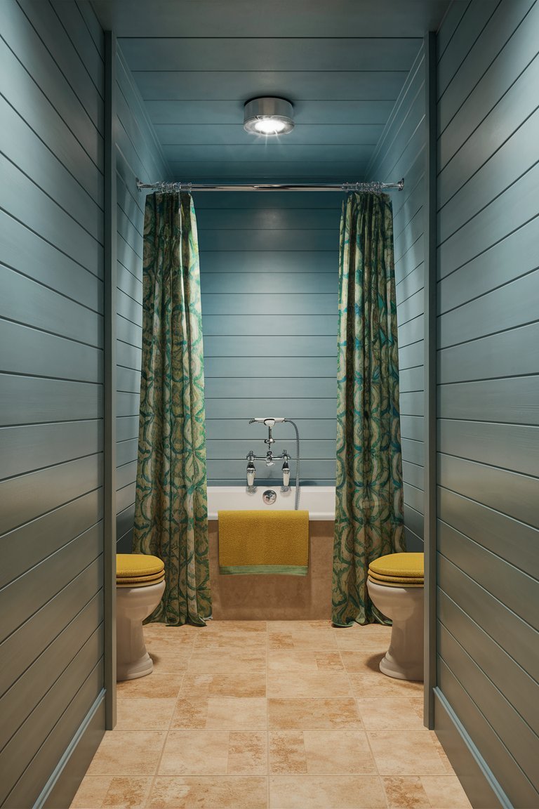 The patterned shower curtains bring an additional layer of sophistication and tie into the farmhouse theme with their subtle, vintage-inspired design. The curtains incorporate shades of teal and earthy tones, harmonizing with both the shiplap walls and floor while adding visual texture. They provide privacy for the bathtub area while also serving as a statement piece, enhancing the room’s style with elegance and charm.