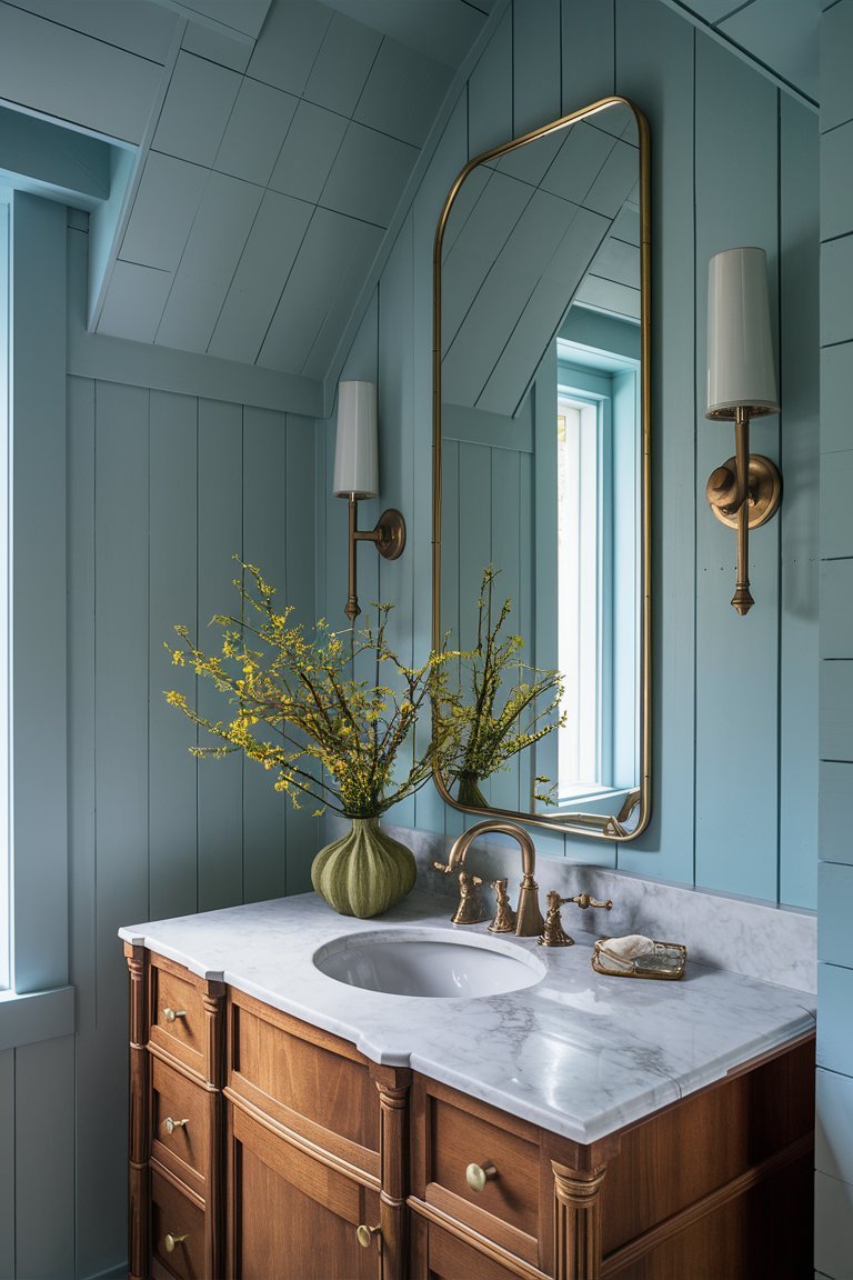 Above the vanity hangs an ornate mirror, featuring a beautifully detailed frame that brings an antique feel to the space. The golden finish of the mirror frame complements the brass fixtures, adding a layer of sophistication and continuity to the design. This mirror isn’t just a practical element; it acts as an art piece, infusing the room with a sense of history and character. By choosing an antique mirror, the design reinforces the farmhouse aesthetic’s connection to vintage elegance, showing how reflective surfaces can enhance a room’s depth and charm.