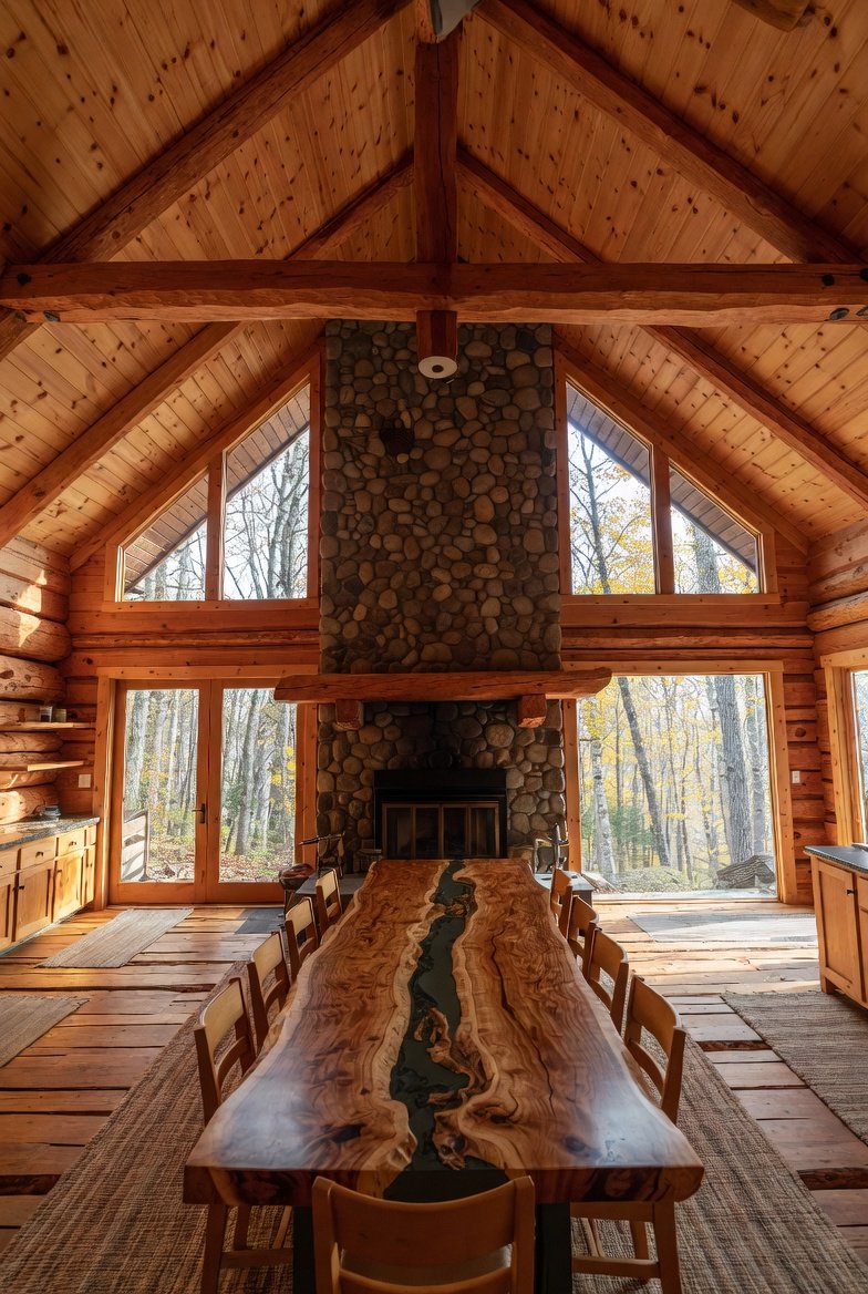 This dining room captures the peaceful feeling of a classic log cabin surrounded by nature. The space features soaring timber ceilings made from raw logs, giving the room a strong rustic character. At the center of the back wall stands a large stone fireplace with a thick wooden mantel, creating a cozy focal point for the entire room. Floor-to-ceiling windows allow sunlight to pour in while showing views of an autumn forest outside. A long live-edge dining table with a glossy epoxy river detail runs through the center of the room, paired with simple wooden chairs that keep the look natural and relaxed. Wide-plank wooden floors are partly covered with woven rugs that add warmth and texture, while a kitchen area sits to the side, making the space feel open and welcoming like a quiet retreat in the woods.