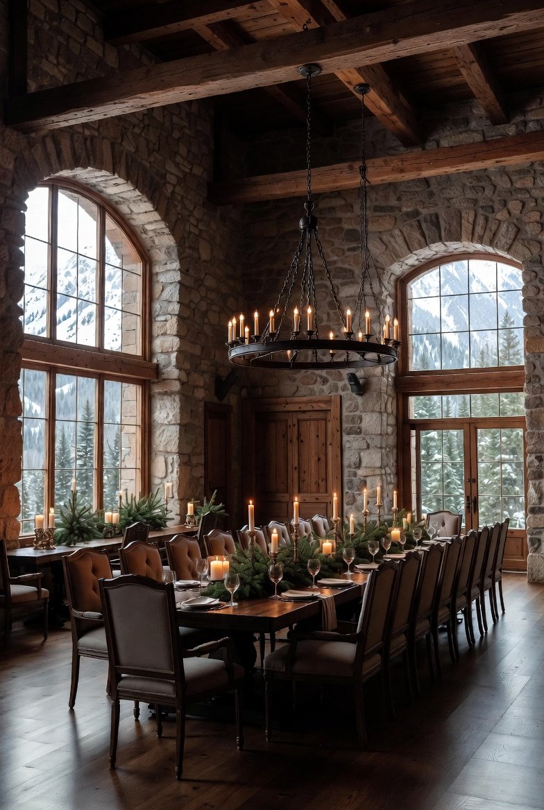 This formal traditional dining room feels like a stately alpine lodge designed for elegant gatherings. The walls are built from rough-cut stone, giving the space a strong and timeless look, while huge arched windows reveal snowy evergreen mountains outside. A long dark wood dining table stretches across the center of the room, set with candles and evergreen decorations that create a warm and inviting centerpiece. High-backed upholstered chairs line both sides of the table, adding comfort and a touch of luxury. Overhead, a large wrought-iron chandelier with candle lights glows softly, reflecting off the wooden beams that cross the ceiling. Heavy wooden doors frame the back wall, completing the feeling of a grand yet cozy lodge where every detail feels rich, warm, and welcoming.