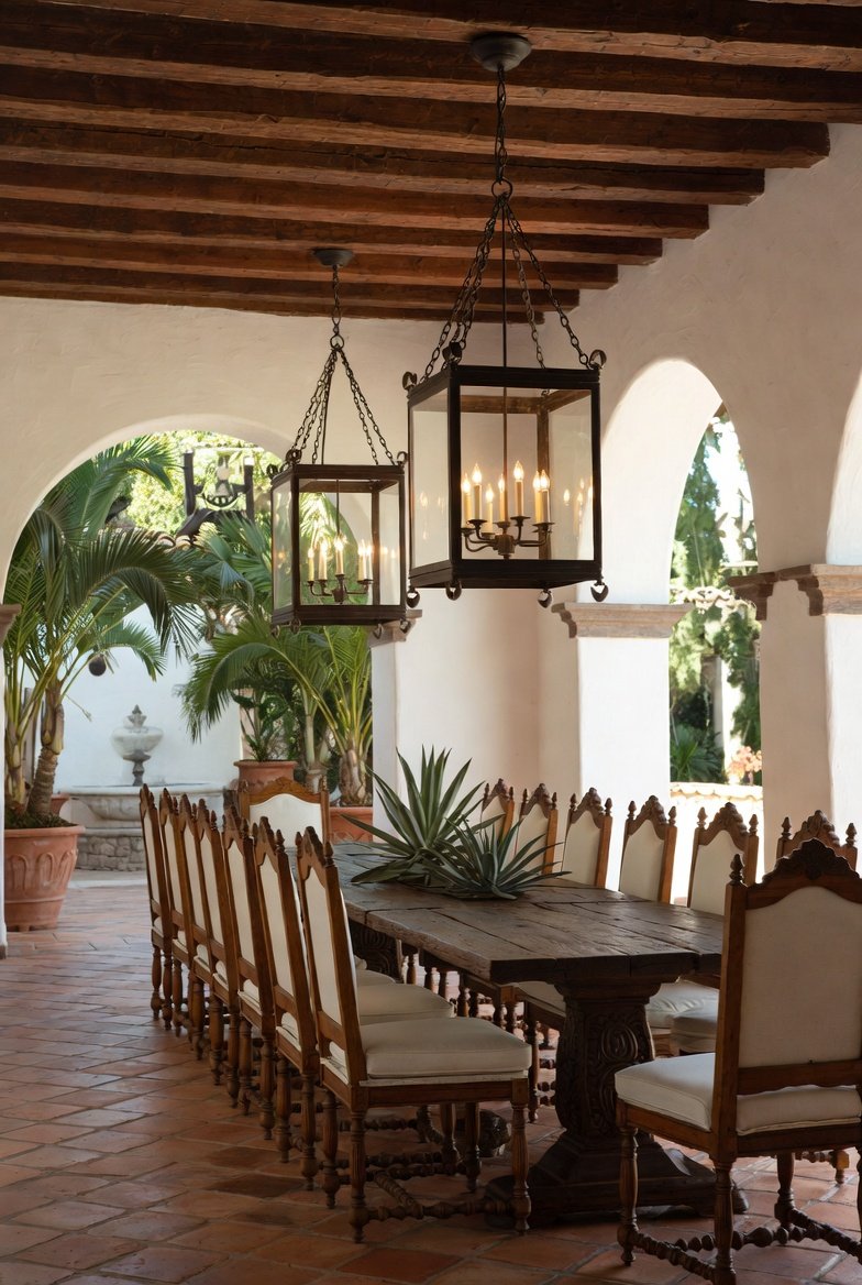 This dining room is inspired by classic Mediterranean homes, filled with sunlight, warm colors, and natural textures. The floor is covered with terracotta tiles that bring earthy warmth, while white stucco walls and thick wooden ceiling beams create a traditional Spanish-style setting. Arched openings line the room, framing large potted palms and allowing soft light to flow inside. A long rustic dining table with carved wooden legs stands in the center, surrounded by tall wooden chairs with cream cushions for comfort. Two large wrought-iron lanterns hang from chains above the table, casting a golden afternoon glow across the space. Through the arches, a garden fountain can be seen, making the room feel open, relaxed, and connected to the outdoors like a peaceful hacienda courtyard.
