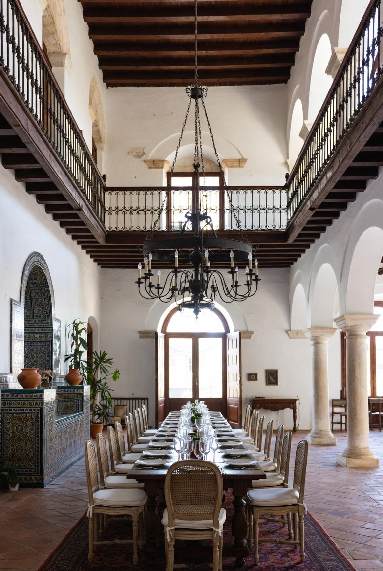This grand dining hall feels inspired by historic homes in southern Spain, with dramatic height and beautiful architectural details. The room rises two stories high, with a mezzanine balcony running along the upper level, protected by ornate wrought-iron railings. White plaster arches and exposed wooden beams create a classic Andalusian look that feels both elegant and welcoming. A long wooden dining table sits in the center, set for a relaxed brunch and surrounded by cane-backed chairs with soft off-white cushions tied at the rails. Along one wall, a colorful tiled alcove displays pottery and plants, adding bright detail to the neutral space. A massive iron chandelier hangs from the ceiling, while sunlight pours through tall arched doors onto a patterned rug laid over terracotta tiles, giving the room a warm, historic, and sophisticated atmosphere.