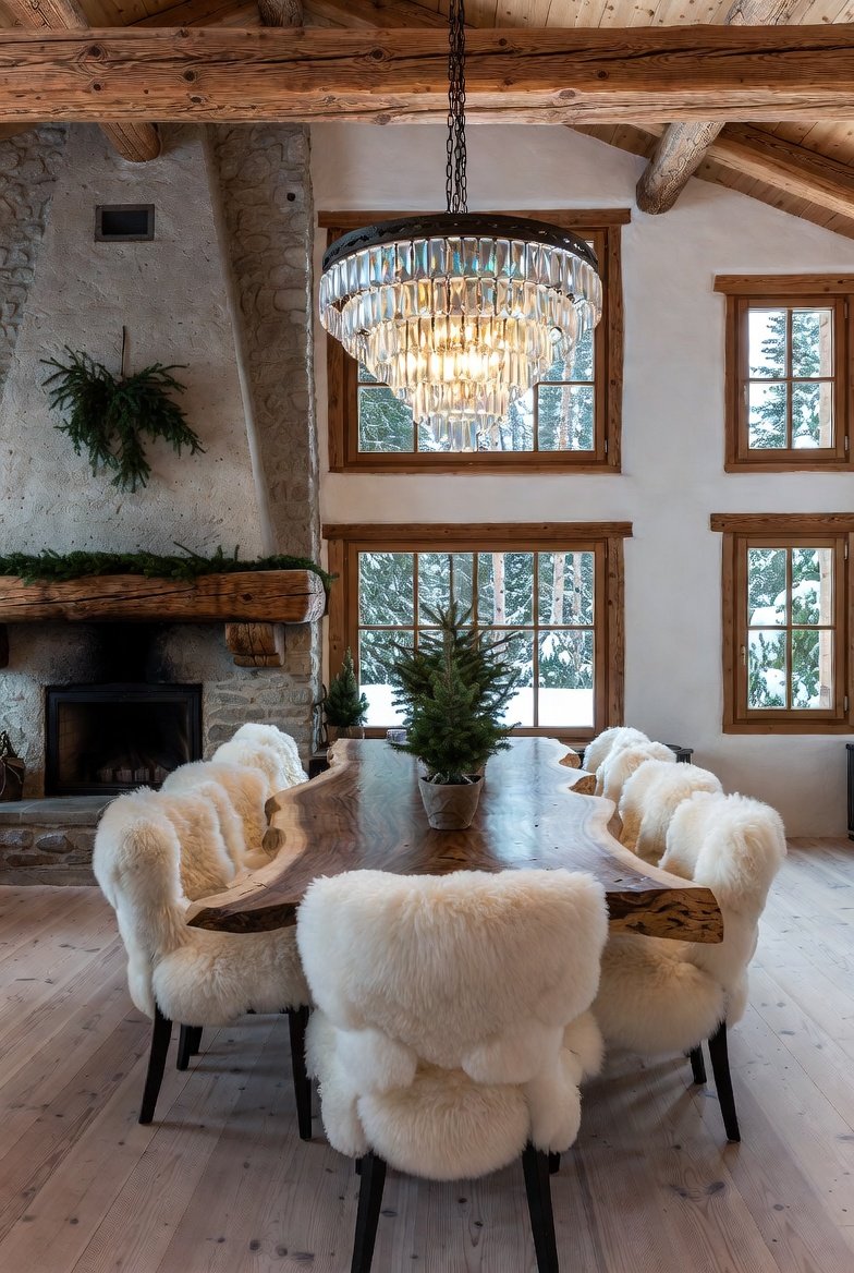 This traditional alpine dining room feels cozy and festive, perfect for winter gatherings in the mountains. A rough stone fireplace stands against one wall, decorated with garlands and a wreath that brings a holiday feeling to the space. Large windows show a snowy pine forest outside, filling the room with soft natural light. In the center sits a thick live-edge slab dining table, surrounded by chairs covered with fluffy white sheepskin for extra warmth. Above the table hangs a dramatic faceted crystal chandelier that sparkles against the knotty pine ceiling beams. Small potted evergreens decorate the table as a simple centerpiece, while pale wood plank floors keep the room bright. The overall mood feels like a cozy winter evening in a mountain lodge, warm, inviting, and perfect for long meals with family and friends.
