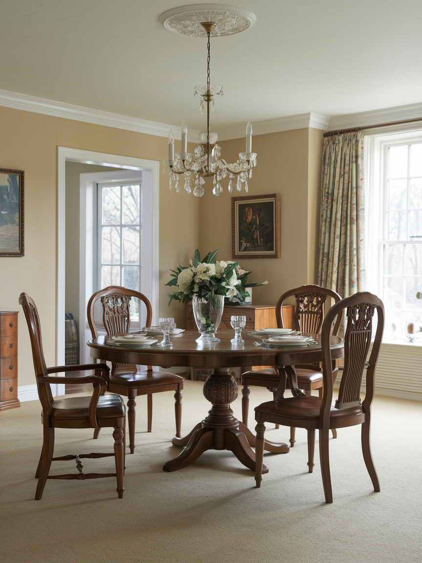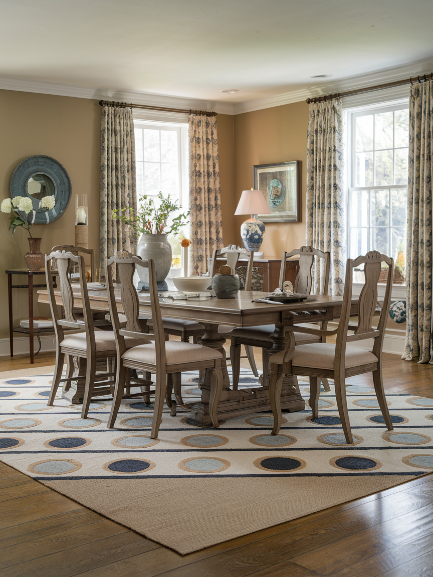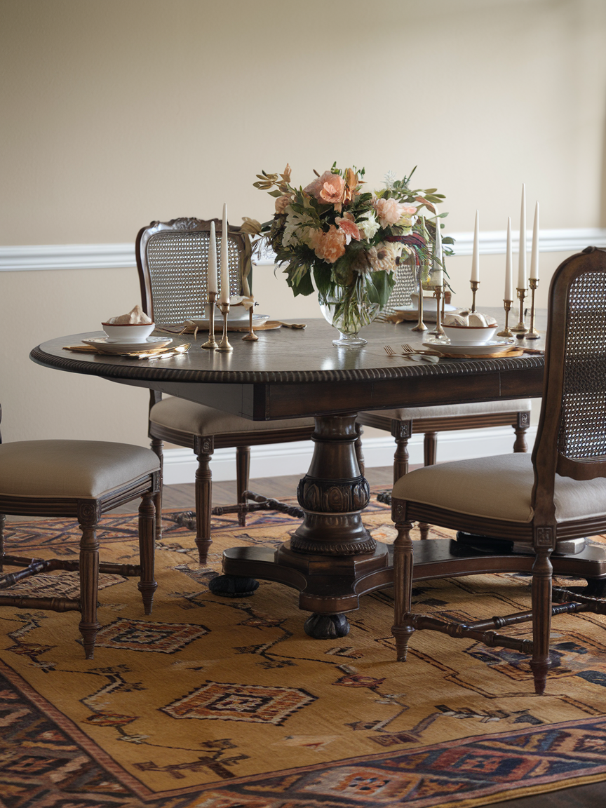 A rug under the dining table helps define the space and adds warmth to the room. Traditional designs often use Persian or oriental-style rugs with detailed patterns and rich colors. The rug should be large enough so chairs can move easily without catching the edge. Adding a rug makes the dining room feel complete and gives the space a softer, more comfortable atmosphere.