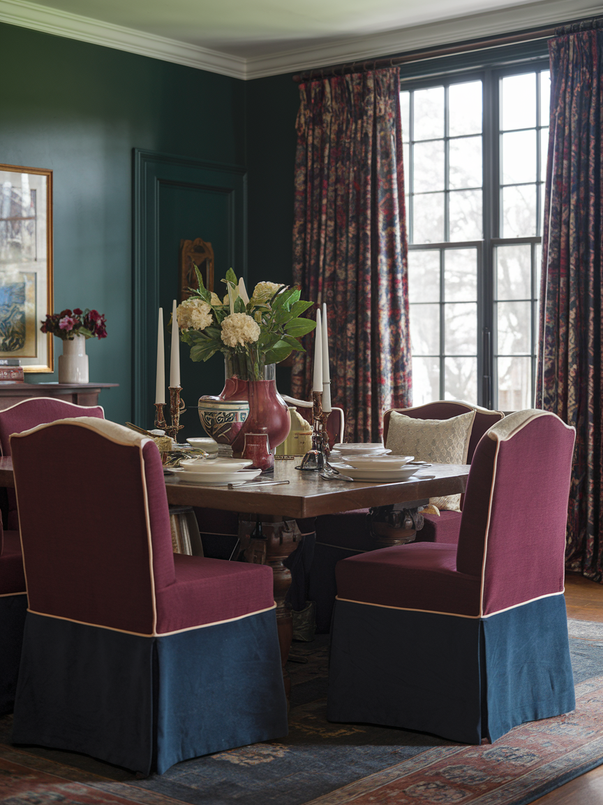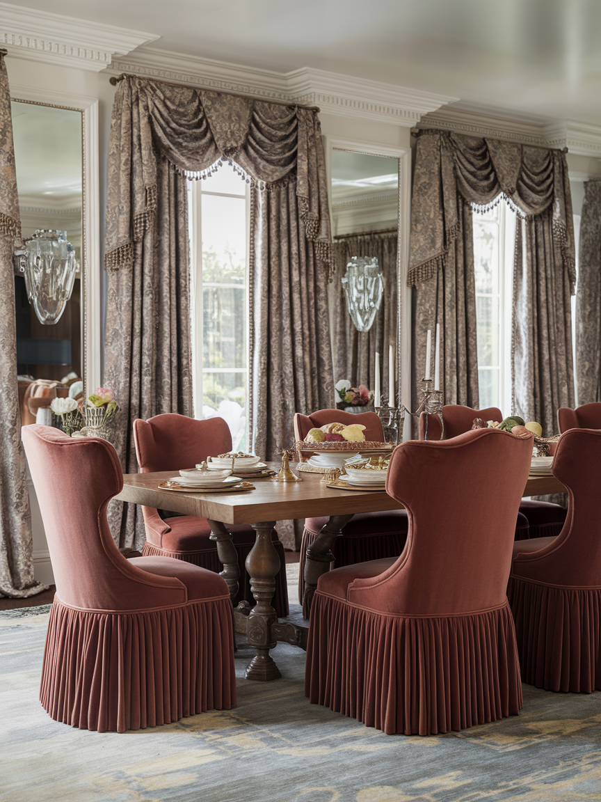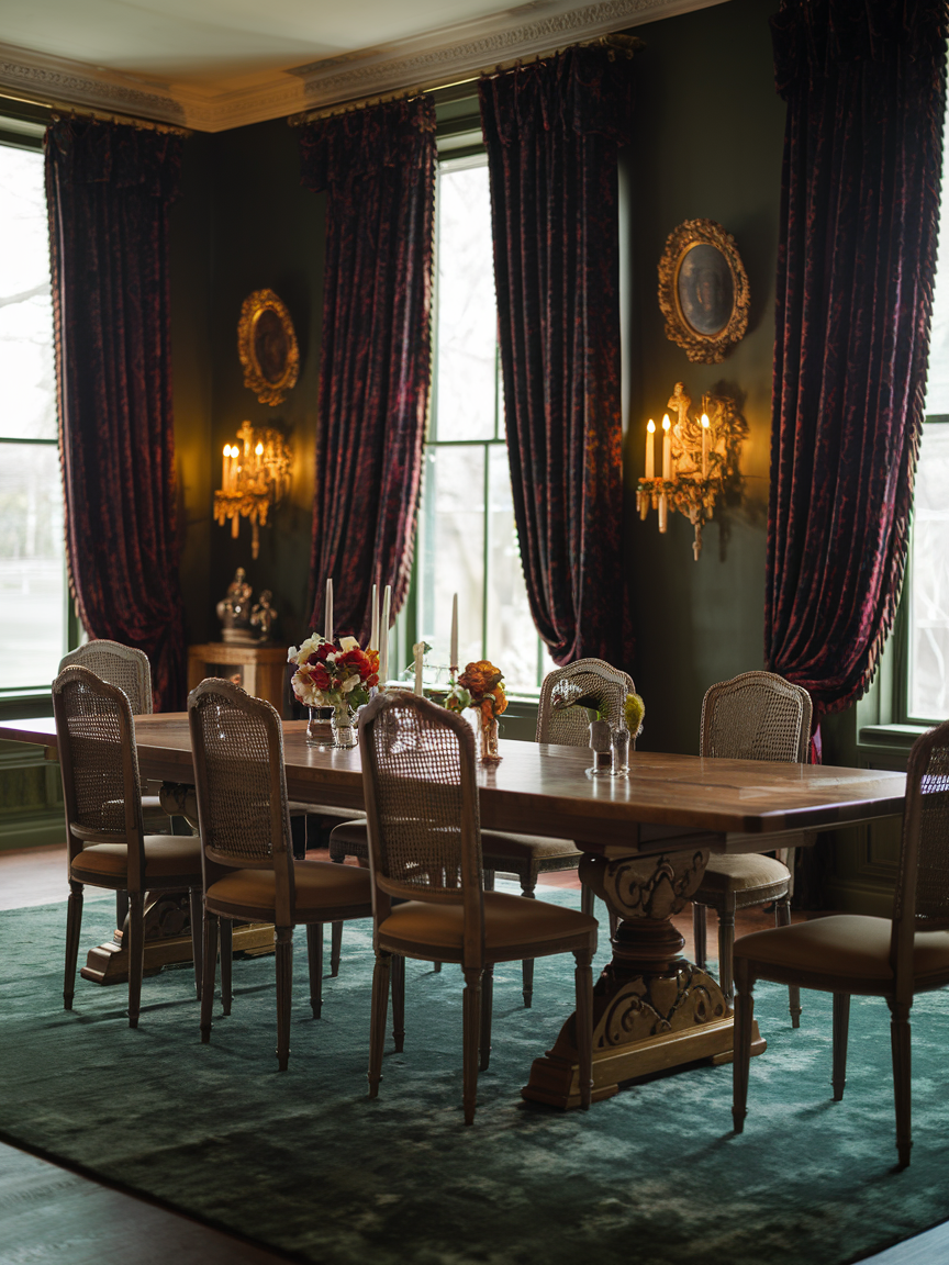 Heavy curtains give a traditional dining room a finished and elegant look. Fabrics like velvet, silk, or thick cotton help soften the space and make it feel more private. Long drapes also help control light and add warmth to the room. Choosing colors that match the furniture or walls keeps the design balanced and calm.