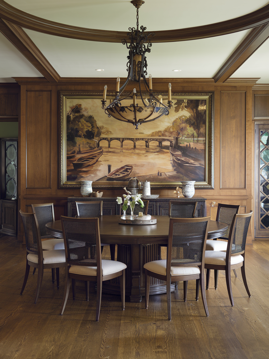 Traditional dining rooms often include framed paintings, landscapes, or family portraits. Artwork adds personality and makes the room feel more complete. Large frames placed above a buffet or arranged in a gallery style create a strong focal point. Choosing art with soft colors helps maintain a peaceful and refined atmosphere.