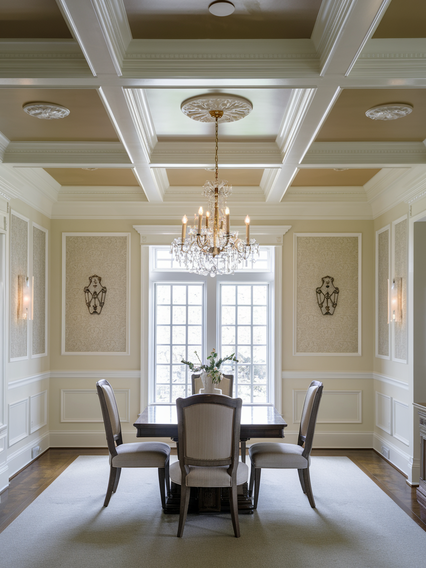 Ceiling details such as crown molding, beams, or coffered panels make a dining room feel more elegant. These features add depth and give the room a finished look. When paired with a chandelier, ceiling details make the entire space feel more formal and carefully designed. Even simple molding can make a big difference in how the room feels.