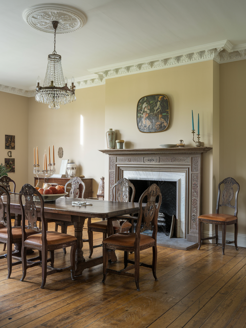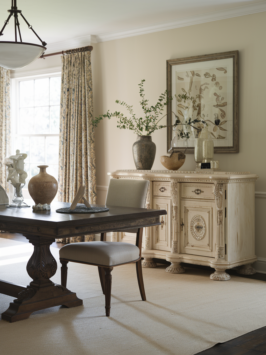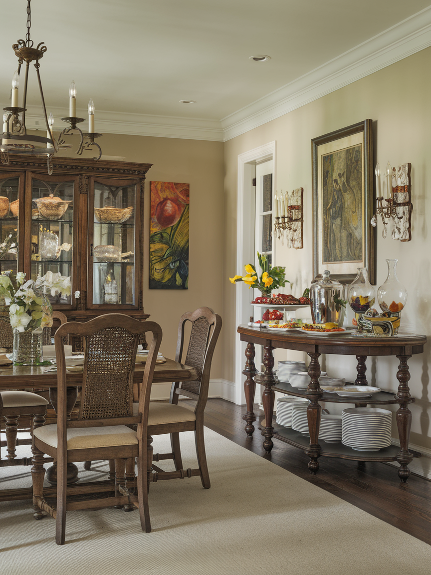 Sideboards provide both storage and style in a traditional dining room. They can hold dishes, linens, or serving pieces while also acting as a display surface. Antique or vintage-style sideboards add character and make the space feel more personal. Decorating the top with candles, flowers, or small objects keeps the room looking warm and welcoming.