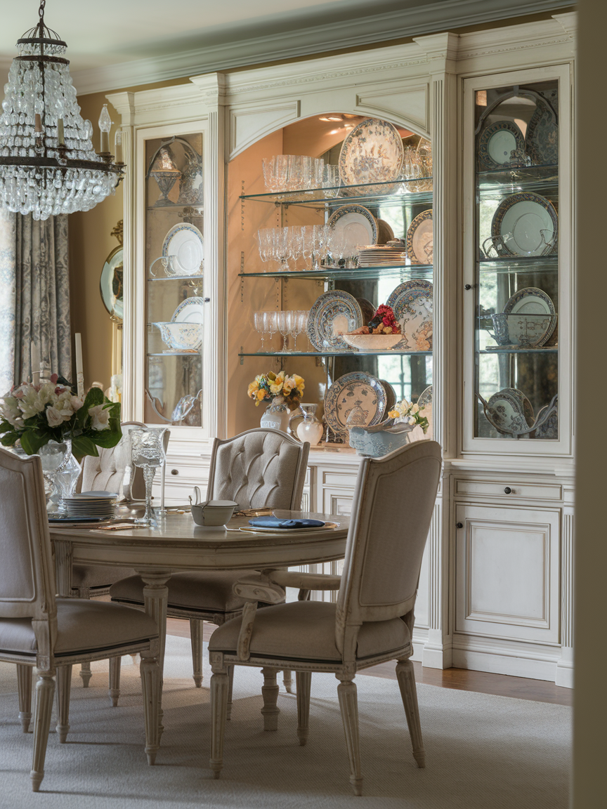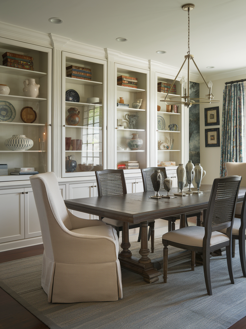 Built-in cabinets and shelves add both beauty and function to a traditional dining room. These features provide a place to store dishes, glassware, linens, and serving pieces while also giving you space to display decorative items. Glass-front cabinets are especially popular because they allow fine china or crystal to become part of the room’s design. Built-ins make the space feel more permanent and thoughtfully planned, which fits perfectly with the timeless look of traditional style. When decorated with care, shelves can hold candles, books, plants, or heirlooms that make the room feel personal. This combination of storage and display helps the dining room stay organized while still looking elegant and welcoming.