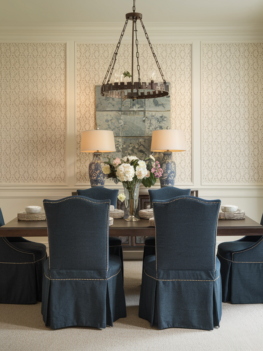 Comfortable seating is important in a dining room where people may sit for long conversations. Upholstered chairs covered in linen, velvet, or patterned fabric add both comfort and elegance. Details such as tufted backs, carved legs, or nailhead trim give the chairs a classic look. Soft seating makes the room feel inviting and encourages guests to stay longer, which is exactly what a traditional dining space is meant for.