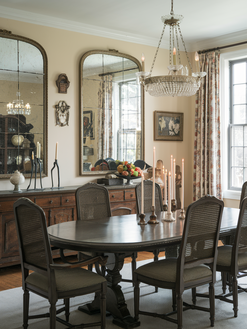 Mirrors are often used in traditional dining rooms to reflect light and make the space feel larger. A mirror with a carved or gilded frame adds elegance while also brightening the room. Placing a mirror above a sideboard or across from a window helps spread natural and artificial light. This simple addition can make the dining area feel more open and welcoming.