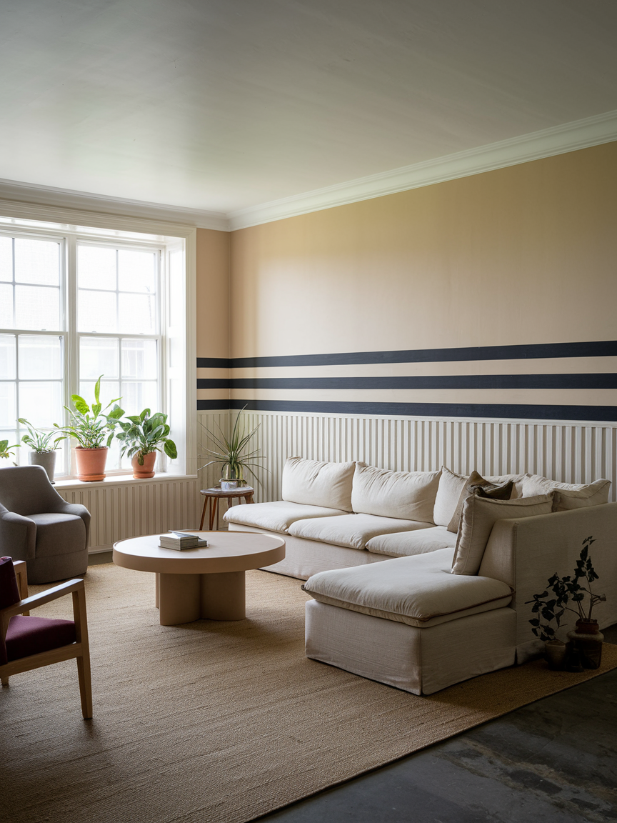 Vertical stripes on your living room walls can work wonders to visually elongate the space and make your ceilings appear higher. The stripes draw the eye upward, creating a sense of verticality that adds dimension to the room. The key is to choose subtle, light-colored stripes to maintain the airy feel of the space. You can opt for wallpaper with thin stripes or create a DIY paint design with painter’s tape. This technique is particularly effective in smaller living rooms where you want to break away from the boxed-in feel of low ceilings.