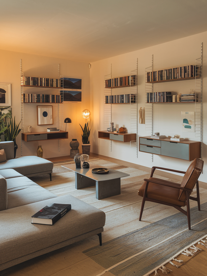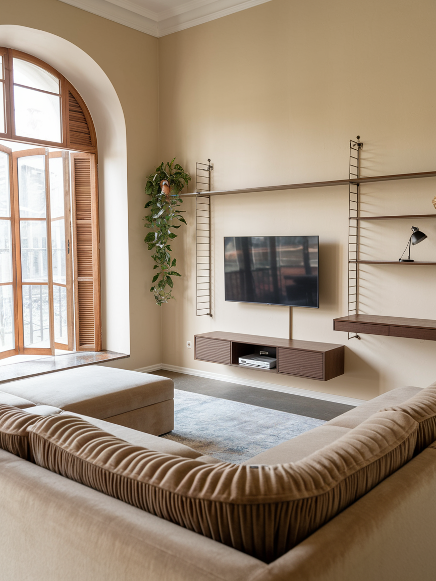 In a small living room, it’s important to choose furniture that doesn’t dominate the space. Wall-mounted furniture, such as slim, low-profile shelves, desks, or TV stands, helps maximize floor space while keeping the room looking sleek and open. By keeping the furniture off the ground and allowing light to pass under it, you create a sense of openness and flow. Additionally, low-profile furniture ensures that the room doesn’t feel crowded or boxed in, which contributes to a more spacious, comfortable atmosphere.
