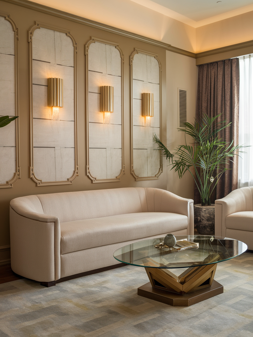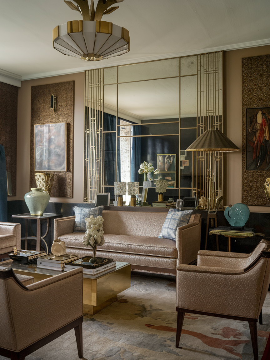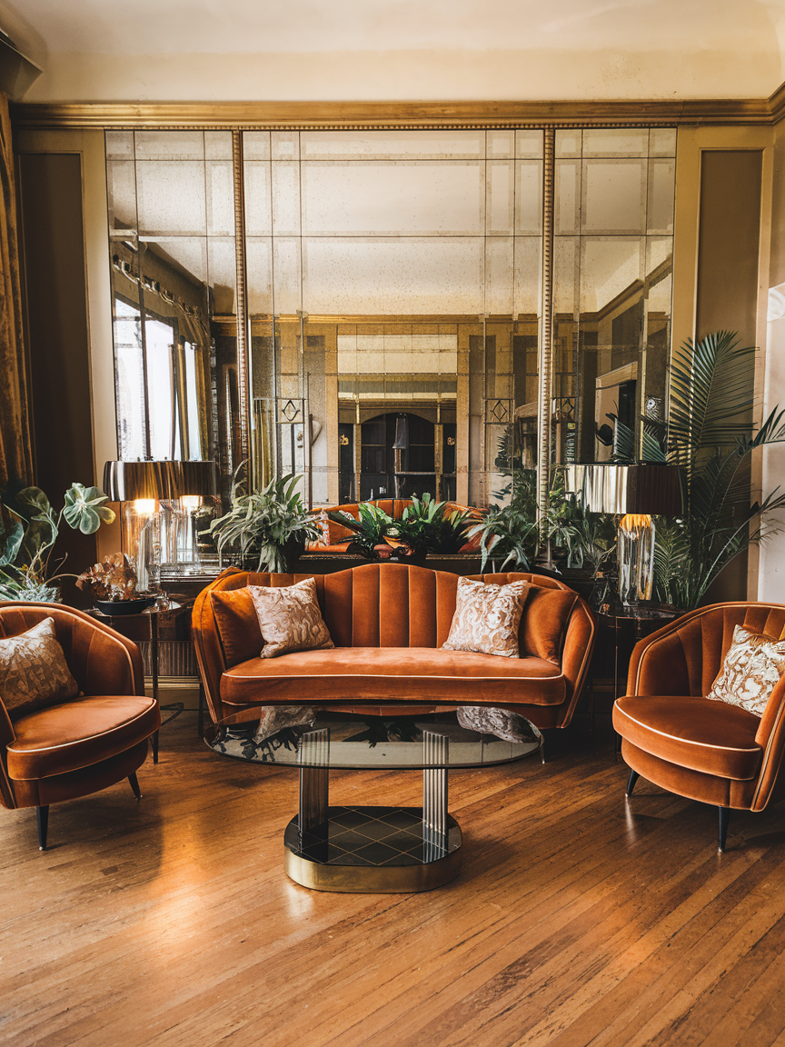 Reflective materials are key to achieving the luminous, glamorous quality associated with Art Deco interiors. Incorporate mirrored side tables, glass-top coffee tables, or decorative mirror panels to enhance light and create the illusion of more space. These elements work particularly well in smaller living rooms, where increasing brightness and visual openness are essential. Pair reflective surfaces with warmer materials such as wood, velvet, or brass to maintain balance and prevent the room from feeling too cold or overly shiny. Thoughtfully placed mirrors also highlight architectural features or focal points, adding both function and sophistication to the overall design.