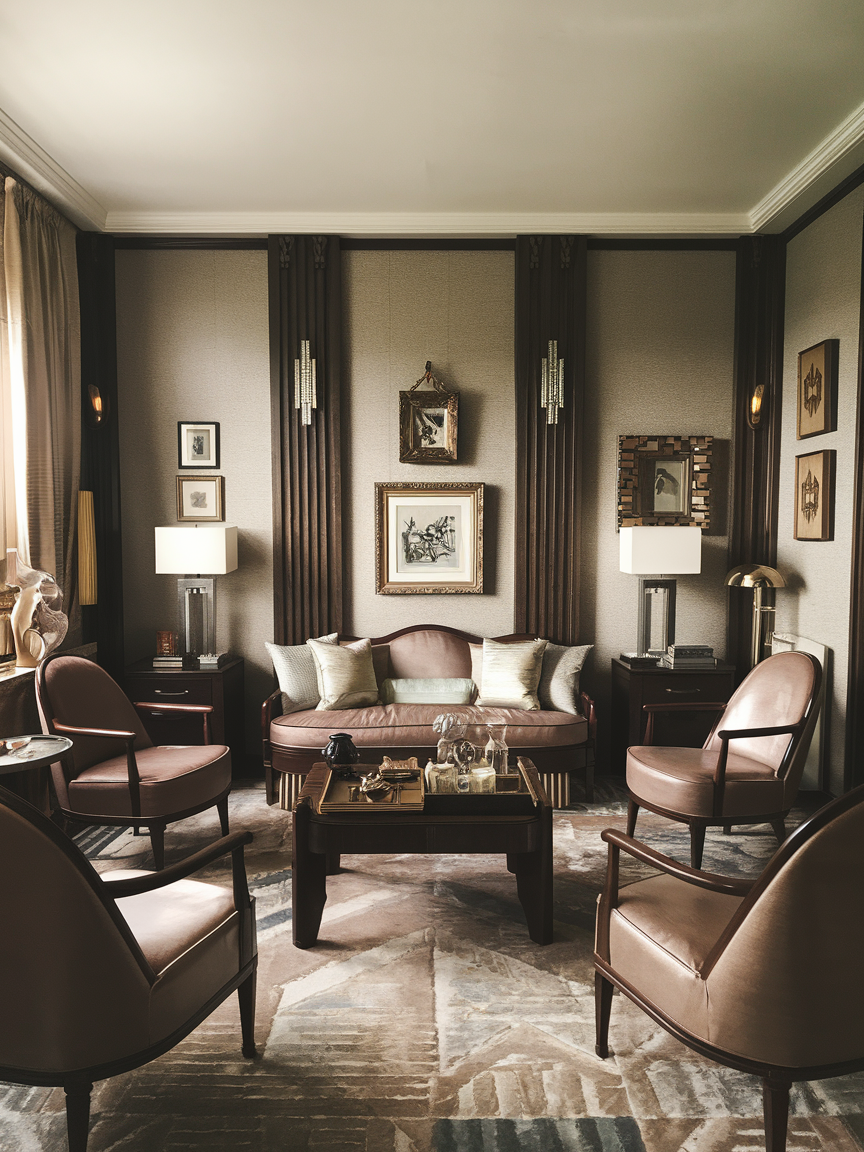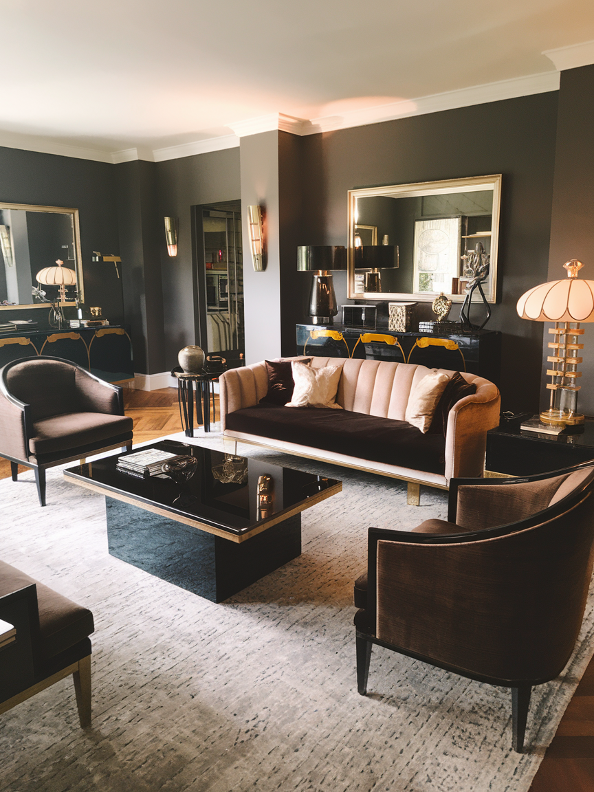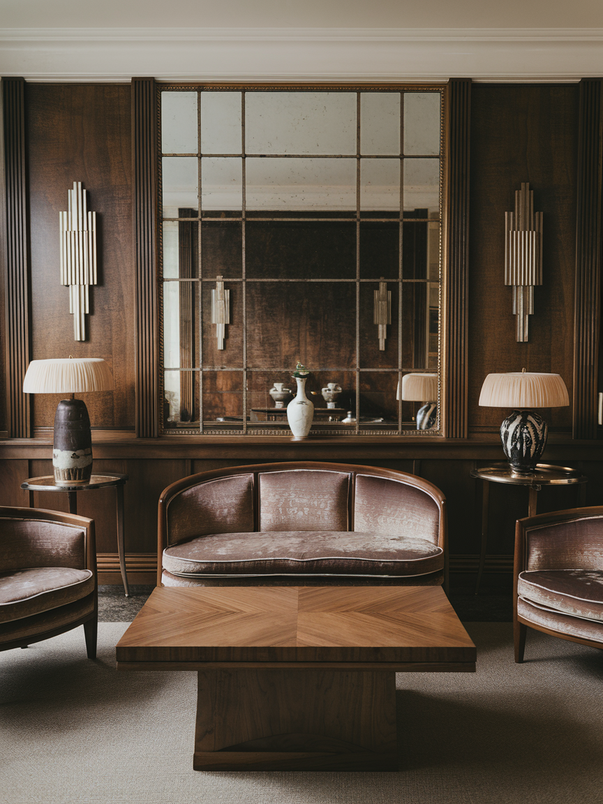 Deep wood finishes such as walnut, mahogany, or ebony-stained oak bring warmth and grounding to an Art Deco living room filled with metallics and glossy surfaces. Incorporate rich wood through coffee tables, cabinetry, shelving, or accent furniture to create visual depth and balance. The natural grain adds subtle texture, preventing the space from feeling overly sleek or cold. Dark wood pairs beautifully with velvet upholstery, marble accents, and brass details, reinforcing the luxurious atmosphere while maintaining a welcoming feel. In modern homes, combining streamlined wood furniture with Art Deco elements creates a timeless look that feels sophisticated without appearing overly traditional or heavy.