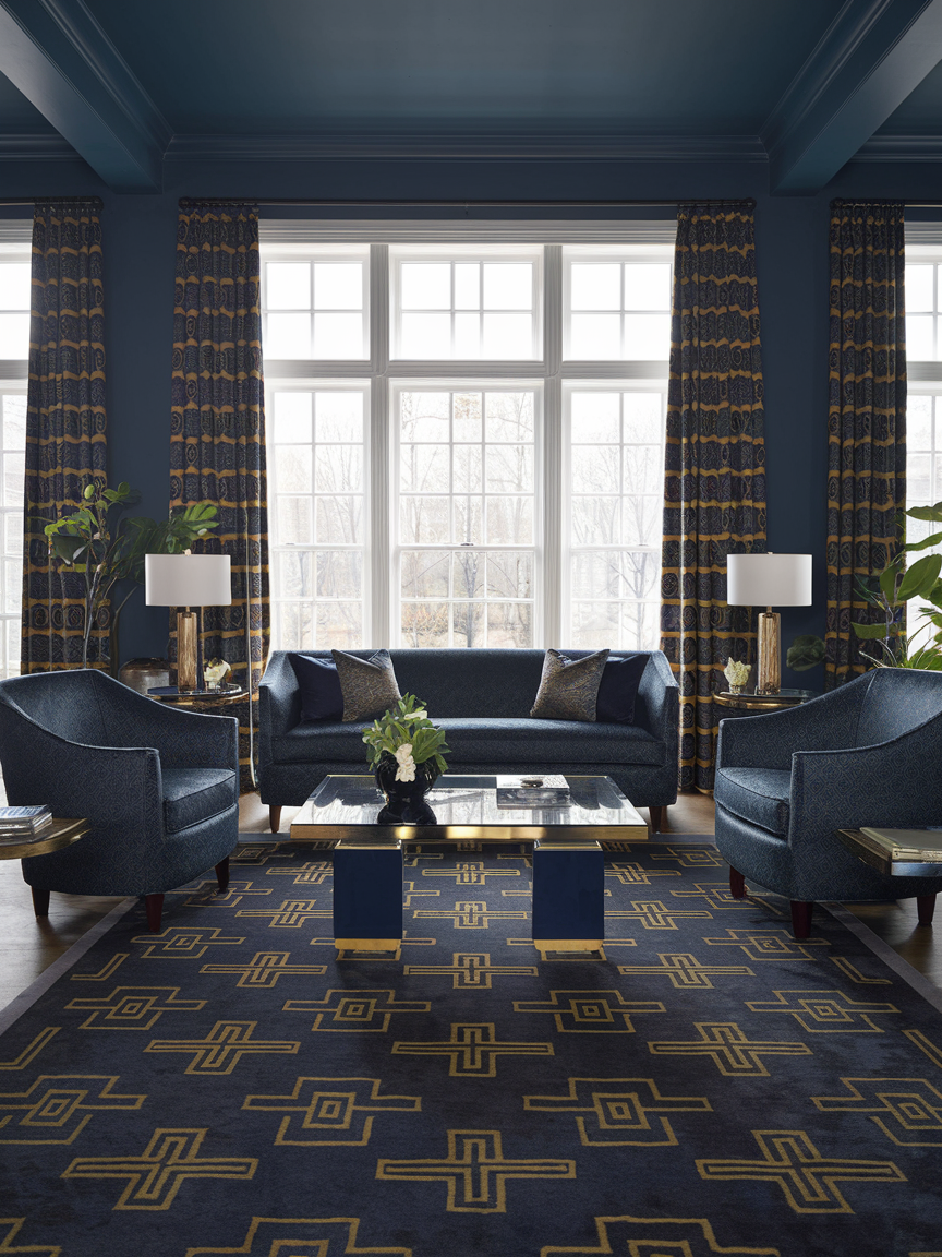 An Art Deco-inspired area rug can define your seating zone while reinforcing the style’s signature geometric character. Look for designs featuring fan shapes, arches, chevrons, or bold linear patterns in contrasting tones or jewel-inspired colors. The rug should feel visually striking yet cohesive with the room’s palette, helping tie together furniture, textiles, and accent pieces. Beyond aesthetics, a high-quality rug adds warmth, comfort, and sound absorption, making the living room feel more inviting for daily use. In larger spaces, a generously sized rug helps anchor the layout and creates a sense of structure. When paired with simple furniture silhouettes, a patterned rug becomes a sophisticated foundation that adds depth without overwhelming the overall design.