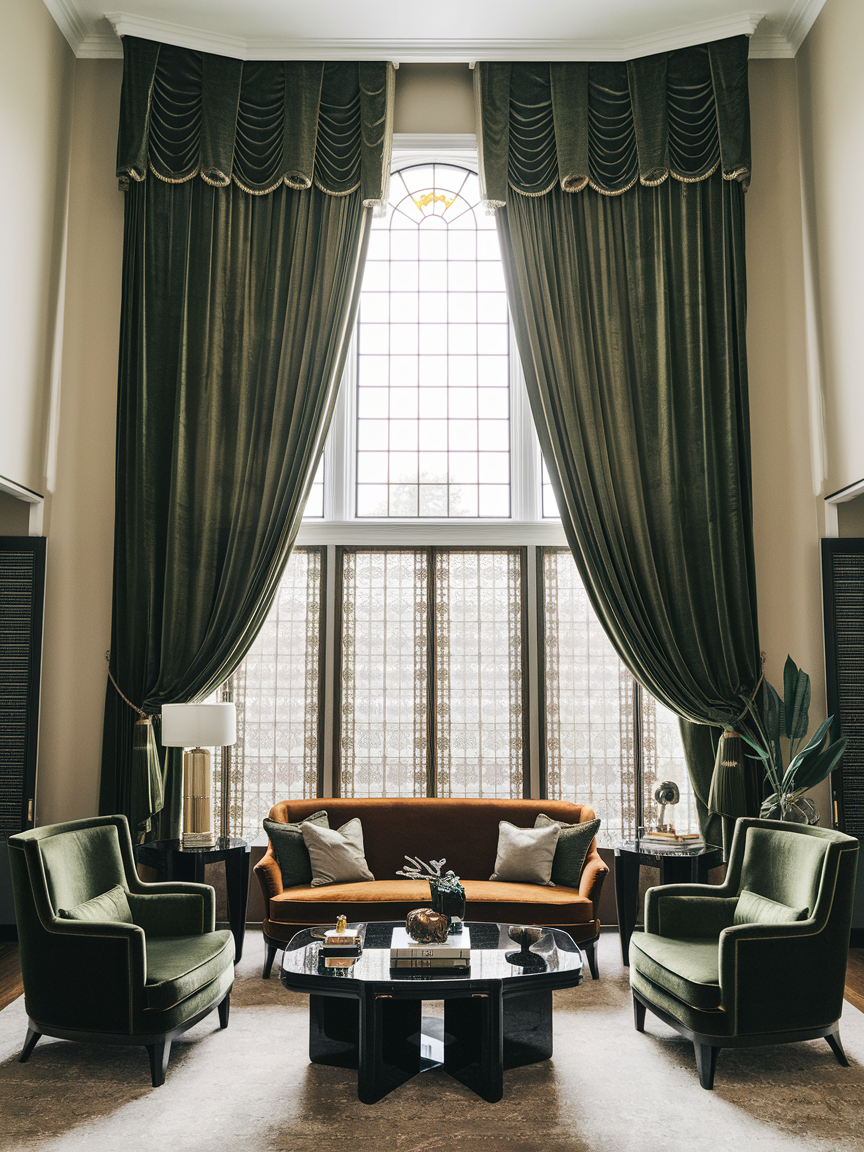 Long, dramatic curtains instantly enhance the sense of luxury in an Art Deco living room. Choose heavy fabrics such as velvet, silk blends, or thick linen in deep tones like emerald, charcoal, or champagne. Hanging the curtain rod close to the ceiling rather than directly above the window creates the illusion of greater height and architectural elegance. The vertical lines also complement the strong geometry often found in Art Deco design. In addition to visual impact, full-length curtains improve light control, insulation, and overall comfort. When paired with layered lighting and plush furnishings, they help create a soft, enveloping atmosphere that feels both glamorous and inviting for everyday living.