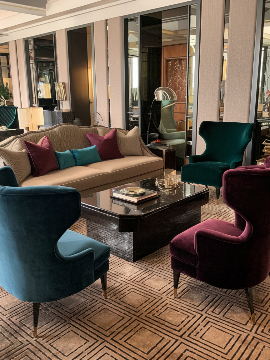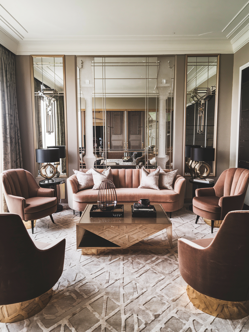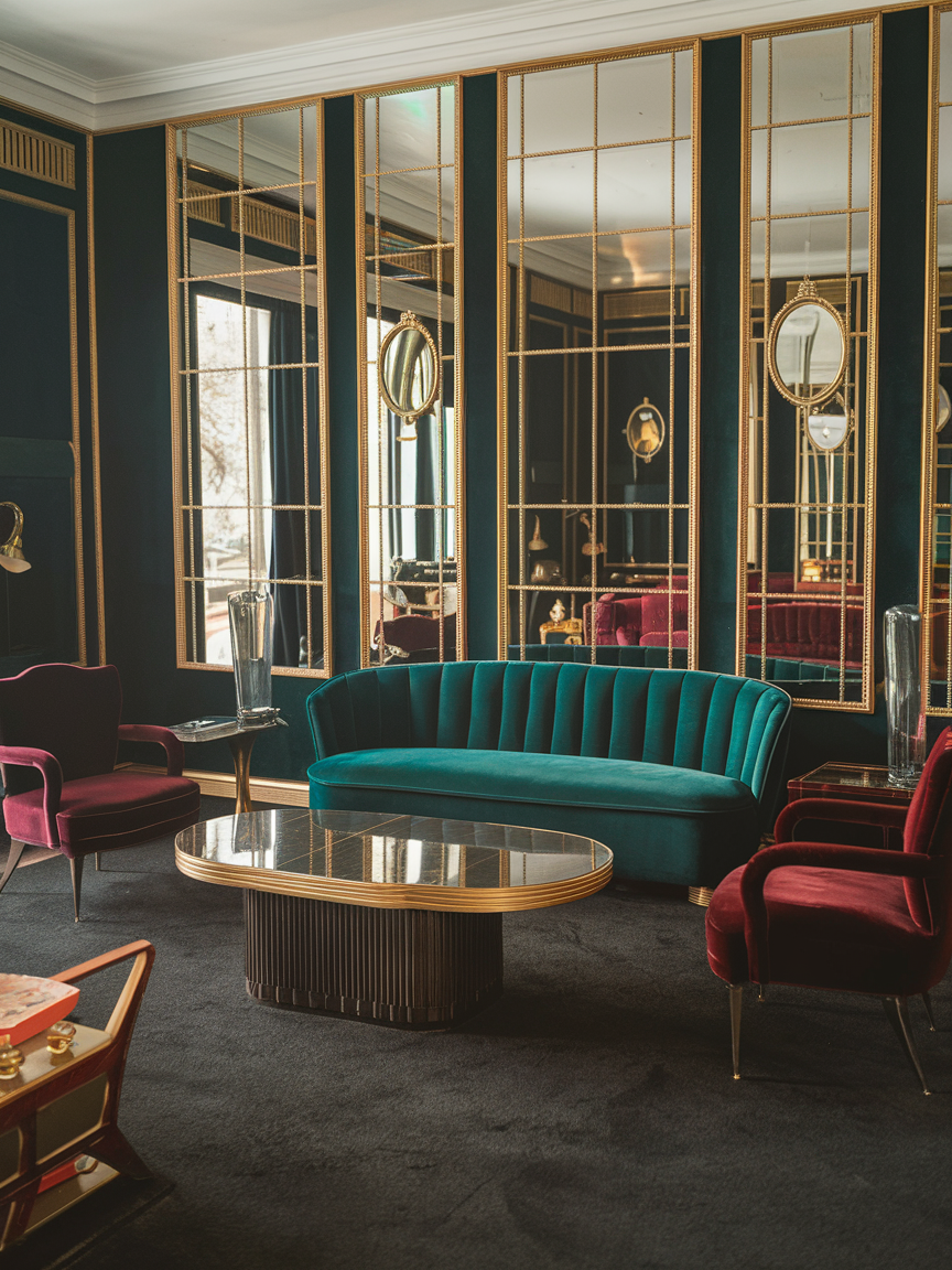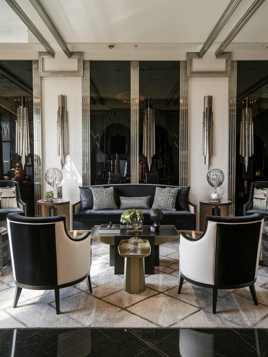 Velvet upholstery, metallic accents, mirrored surfaces, and sculptural furniture pieces add depth and character while maintaining a polished look. Strong patterns, symmetrical layouts, and a thoughtful mix of textures help capture the signature Art Deco aesthetic without overwhelming the space. Neutral backdrops paired with jewel tones or classic black-and-gold combinations enhance the feeling of luxury and cohesion.