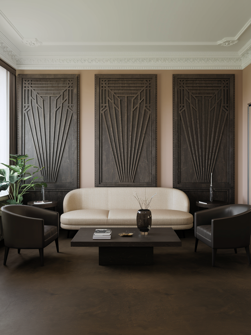 Geometric wall paneling or molding adds subtle architectural interest that perfectly complements Art Deco design principles. Create patterns using rectangular frames, stepped designs, or symmetrical layouts to add depth without relying on bold colors or heavy décor. Painting the panels in a rich tone or soft neutral keeps the look sophisticated and timeless. This treatment works especially well behind a sofa, fireplace, or media wall, helping define the focal point of the room. Decorative paneling adds structure and elegance while elevating the overall design, making the space feel thoughtfully planned and visually complete.