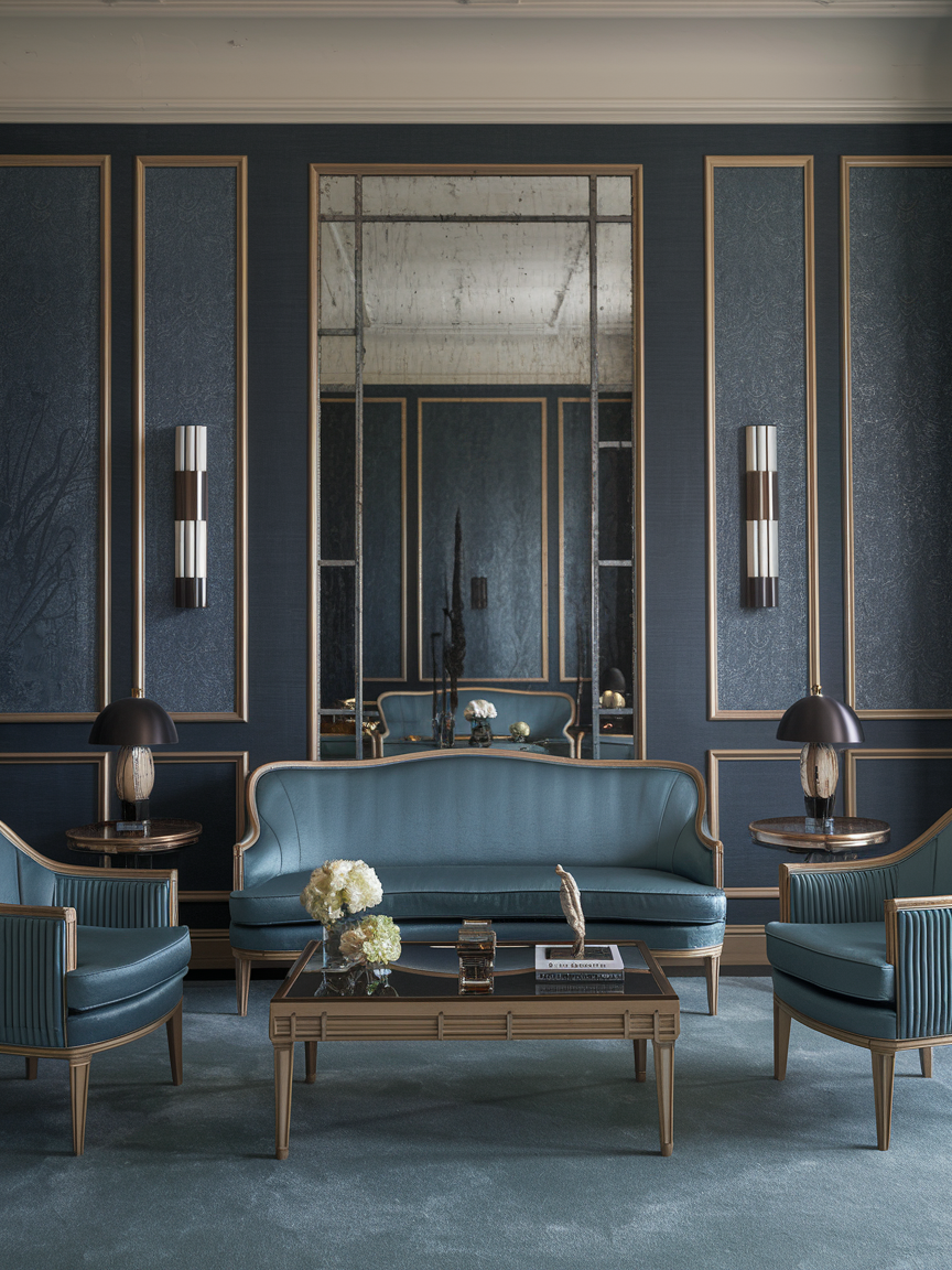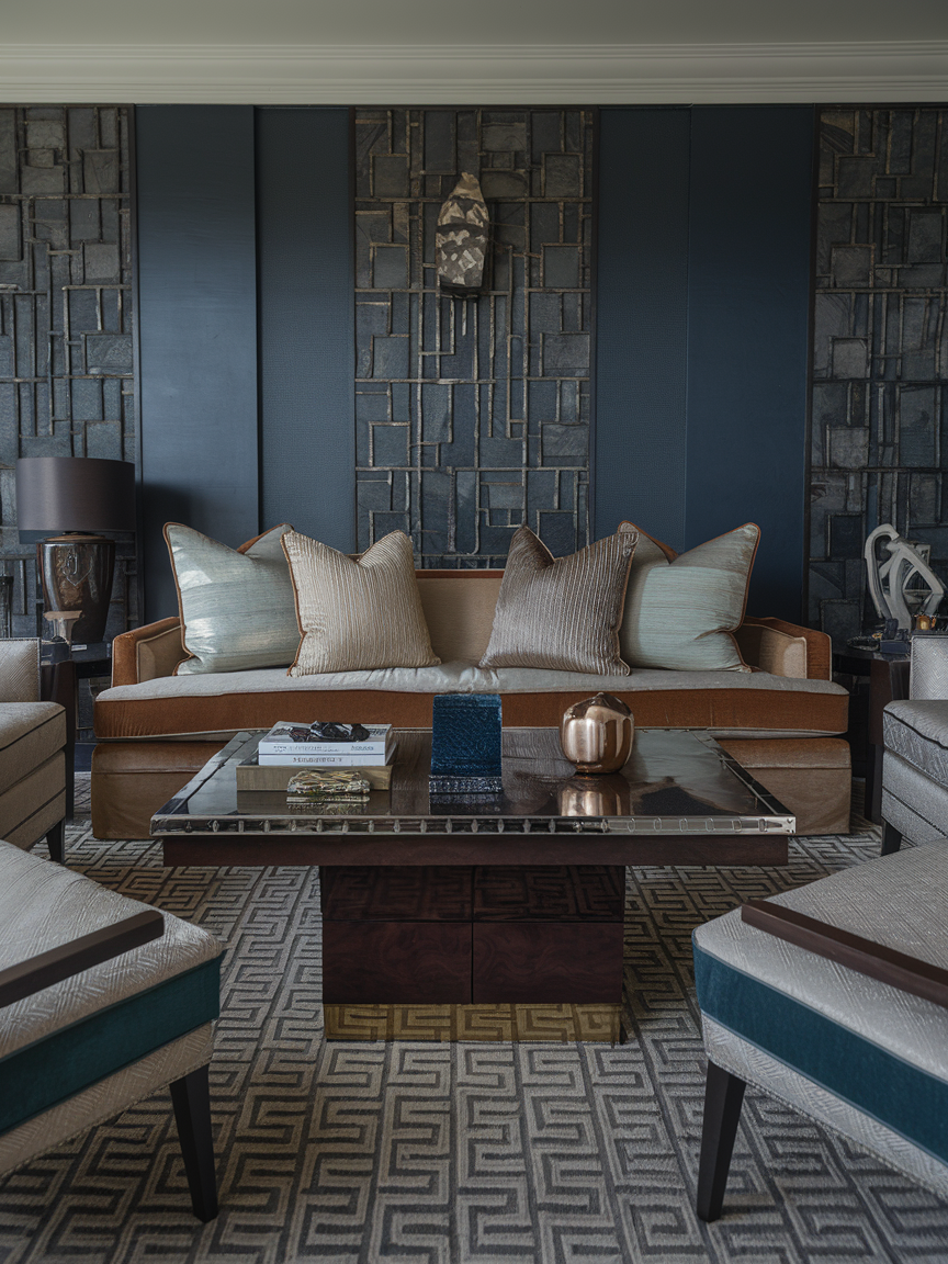 Art Deco design emphasizes balance and structure. Arrange your furniture in a symmetrical layout with matching chairs, identical lamps, or evenly spaced décor elements. This creates a sense of order and visual harmony that feels both calming and sophisticated. A centered coffee table, paired seating, and aligned artwork help reinforce the structured aesthetic. Symmetry not only enhances the Art Deco style but also makes the living room feel intentional and well-designed for everyday comfort.