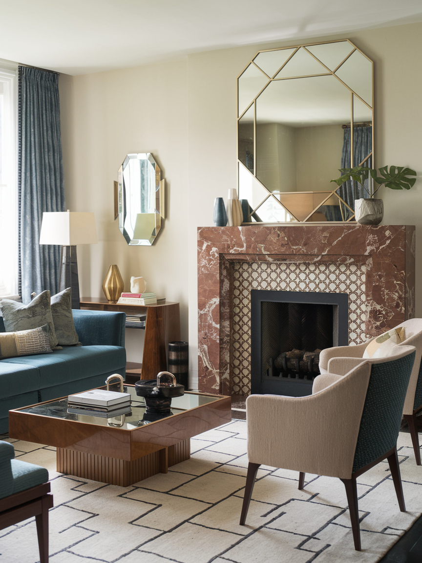 If your living room includes a fireplace, enhance it as a focal point with Art Deco-inspired details. A geometric mirror, marble surround, or metallic accessories can transform the area into a dramatic centerpiece. Keep the mantel styling balanced with symmetrical décor such as matching vases or sculptural objects. This approach highlights architectural features while strengthening the room’s overall design theme.