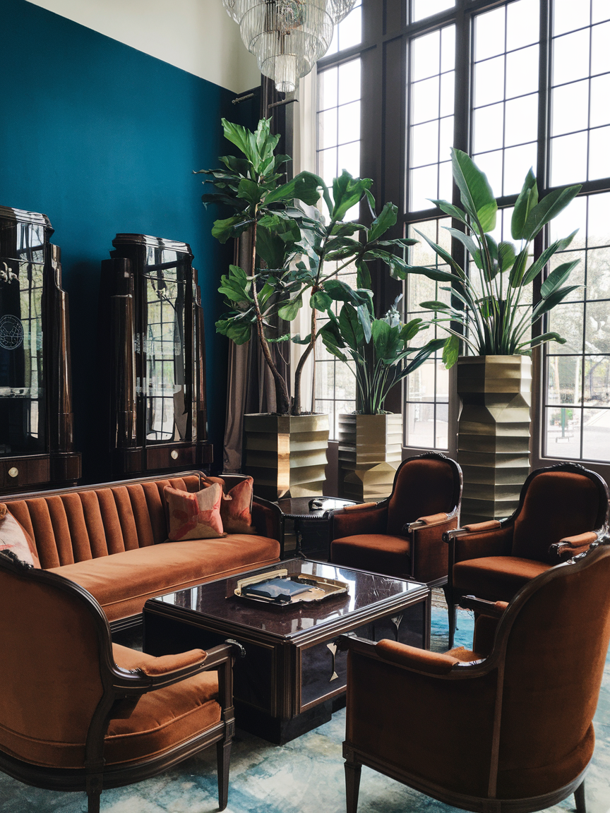 Adding greenery introduces freshness and softness that balances the richness of Art Deco materials. Choose plants with strong shapes, such as snake plants or palms, and place them in metallic, ceramic, or geometric planters. The contrast between natural foliage and structured containers enhances visual interest while keeping the design cohesive. Plants also improve the room’s atmosphere, making it feel lively and welcoming.
