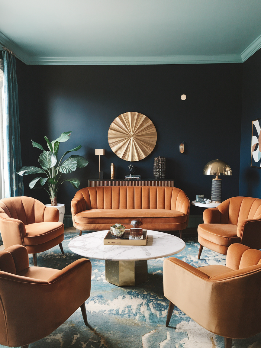 Accent chairs in rich hues such as sapphire blue, emerald green, deep plum, or burnt amber introduce depth and visual richness to the living room. Look for designs with curved backs, channel tufting, or sleek metal legs to reflect classic Art Deco influences. These chairs not only provide additional seating but also serve as statement pieces that enhance the room’s color story. Pair them with a neutral sofa or balanced metallic accents to keep the overall look cohesive. Soft velvet or textured upholstery adds comfort while reinforcing the luxurious aesthetic, making the space both stylish and practical for everyday use.